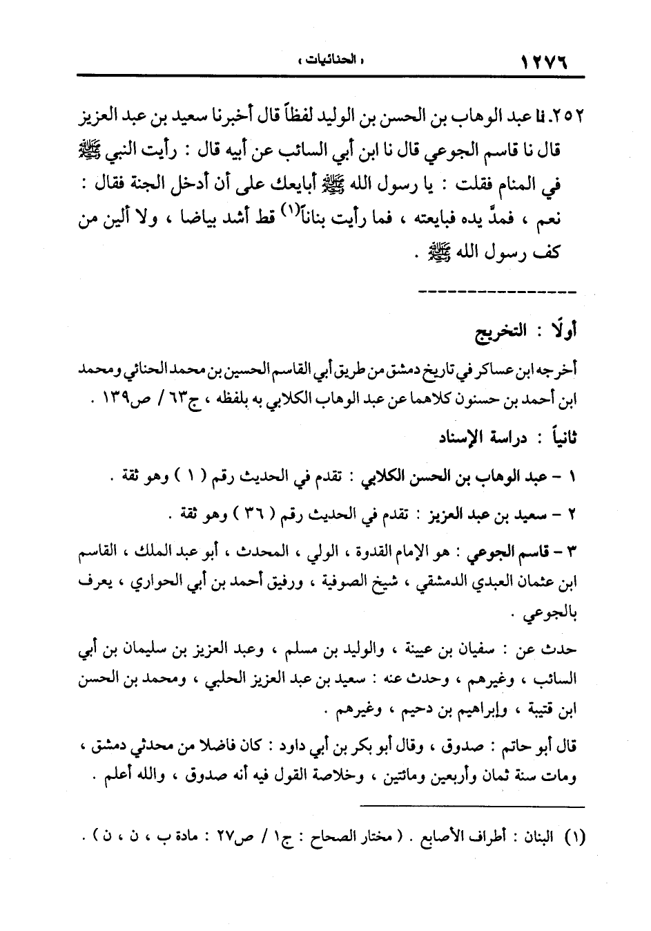 252-[261] نا عَبْدُ الْوَهَّابِ بْنُ الْحَسَنِ بْنِ الْوَلِيدِ لَفْظًا قَالَ أَخْبَرَنَا سَعِيدُ بْنُ عَبْدِ الْعَزِيزِ قَالَ نا قَاسِمٌ الْجُوعِيُّ قَالَ نا ابْنُ أَبِي السَّائِبِ عَنْ أَبِيهِ قَالَ: رَأَيْتُ النَّبِيَّ صلى الله عليه وسلم فِي الْمَنَامِ فَقُلْتُ: يَا رَسُولَ اللَّهِ صَلَّى اللَّهُ عَلَيْهِ وَسَلَّمَ أُبَايِعُكَ عَلَى أَنْ أَدْخُلَ الجنة فقال: نعم فمد يده فبايعته فَمَا رَأَيْتُ بَنَانًا قَطُّ أَشَدَّ بَيَاضًا وَلا أَلْيَنَ مِنْ كَفِّ رَسُولِ اللَّهِ صَلَّى اللَّهُ عليه وسلم.