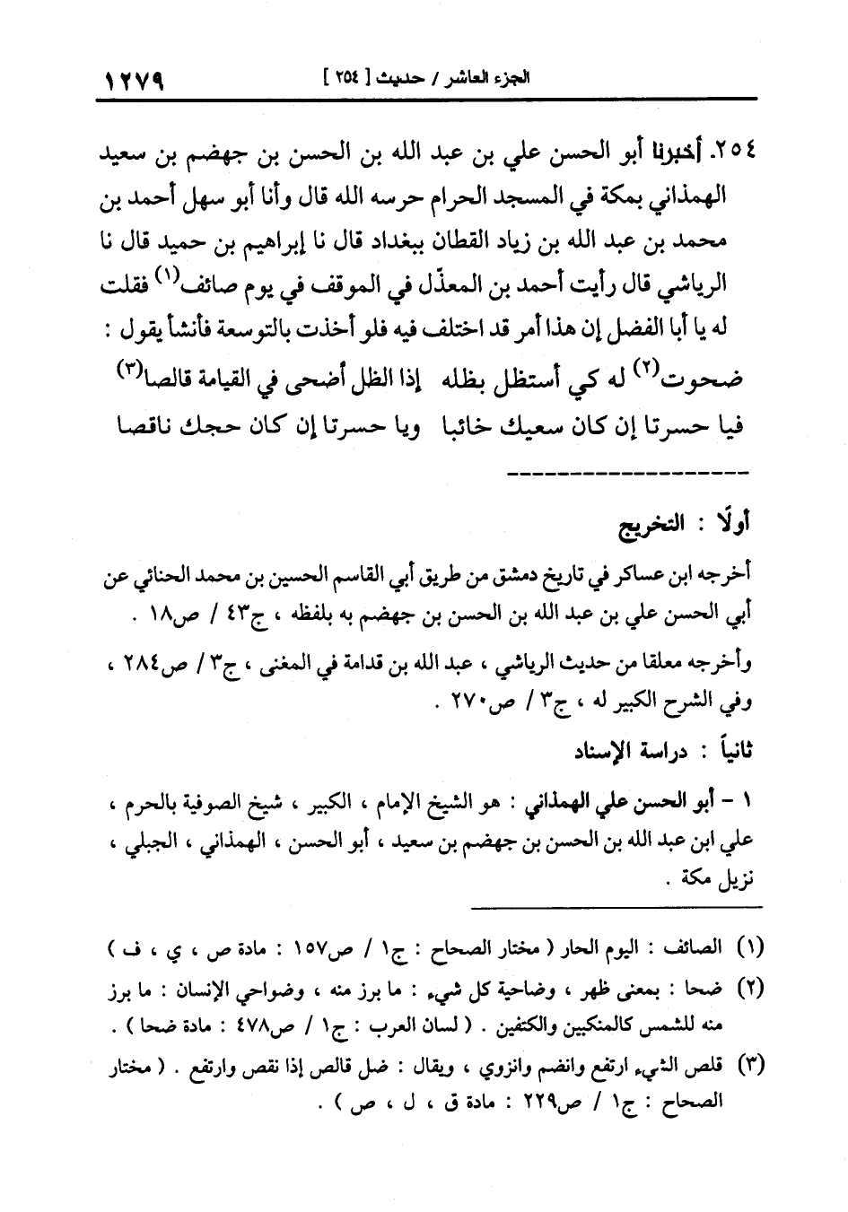 254-[263] أَخْبَرَنَا أَبُو الْحَسَنِ عَلِيُّ بْنُ عَبْدِ اللَّهِ بْنِ الْحَسَنِ بْنِ جَهْضَمِ بْنِ سَعِيدٍ الْهَمَذَانِيُّ بِمَكَّةَ فِي الْمَسْجِدِ الْحَرَامِ حَرَسَهُ اللَّهُ قَالَ وأنا أَبُو سَهْلٍ أَحْمَدُ بْنُ مُحَمَّدِ بْنِ عَبْدِ اللَّهِ بْنِ زِيَادٍ الْقَطَّانُ بِبَغْدَادَ قَالَ نا إِبْرَاهِيمُ بْنُ حُمَيْدٍ قَالَ نا الرِّيَاشِيُّ قَالَ رأيت أحمد بن المعذل فِي الْمَوْقِفِ فِي يَوْمٍ صَائِفٍ فَقُلْتُ لَهُ يَا أَبَا الْفَضْلِ إِنَّ هَذَا أَمْرٌ قَدِ اخْتُلِفَ فِيهِ فَلَوْ أَخَذْتَ بِالتَّوْسِعَةِ فَأَنْشَأَ يَقُولُ: