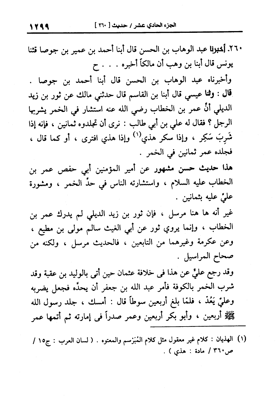 قال: وثنا عيسى قال أبنا ابن القاسم قال حدثني مالك عن ثور بن زيد الديلي أَنَّ عُمَرَ بْنَ الْخَطَّابِ رَضِيَ اللَّهُ عَنْهُ استشار في الخمر يشربها الرجل؟ فقال له علي بن أبي طالب: نرى أن تجلدوه ثمانين فإنه إذا شرب سكر وإذا سكر هذي وإذا هذي افترى أو كما قال فجلده عمر ثمانين في الخمر.