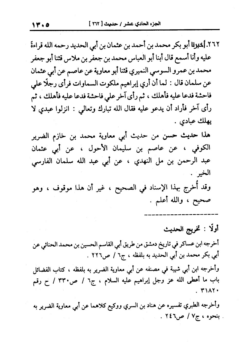262-[271] أَخْبَرَنَا أَبُو بَكْرٍ مُحَمَّدُ بْنُ أَحْمَدَ بْنِ عثمان بن أبي الحديد رَحِمَهُ اللَّهُ قِرَاءَةً عَلَيْهِ وَأَنَا أَسْمَعُ قَالَ أبنا أبو العباس محمد بن جعفر بن ملاس قال: ثنا أَبُو جَعْفَرٍ مُحَمَّدُ بْنُ عَمْرٍو السُّوسيُ النُّمَيْرِيُّ قال: ثنا أبو معاوية عن عاصم عن أبي عثمان عن سلمان قال: لما أن أري إبراهيم ملكوت السماوات فرأى رجلا على فاحشة فدعا عليه فأهلك ثم رأى آخر على فاحشة فدعا عليه فأهلك ثم رأى آخر فأراد أن يدعو عليه فقال الله تبارك وتعالى: انزلوا عبدي لا يهلك عبادي.