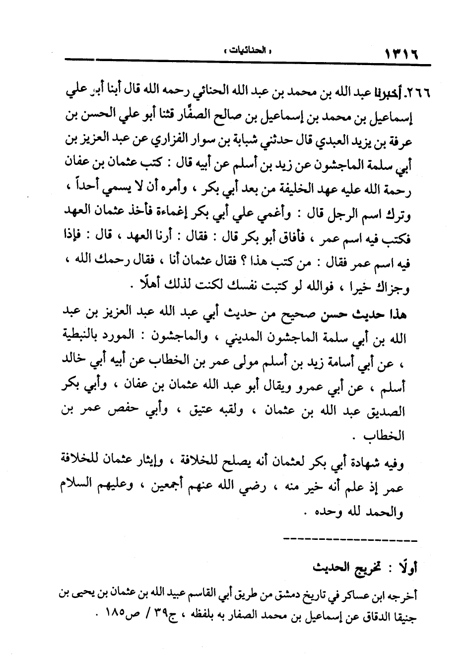 266-[275] أَخْبَرَنَا عَبْدُ اللَّهِ بْنُ مُحَمَّدِ بْنِ عَبْدِ الله الحنائي رحمه الله قال أبنا أَبُو عَلِيٍّ إِسْمَاعِيلُ بْنُ مُحَمَّدِ بْنِ إِسْمَاعِيلَ بن صالح الصفار قال: ثنا أَبُو عَلِيٍّ الْحَسَنُ بْنُ عَرَفَةَ بْنِ يَزِيدَ العبدي قال حدثني شبابة بن سوار الفزاري عن عَبْدُ الْعَزِيزِ بْنُ أَبِي سَلَمَةَ الْمَاجِشُونُ عَنْ زيد بن أسلم عن أبيه قال: كتب عثمان بن عفان رحمة الله عليه عهد الخليفة من بعد أبي بكر وأمره أن لا يسمي أحدا وترك اسم الرجل قال: وأغمي على أبي بكر إغماءة فأخذ عثمان العهد فكتب فيه اسم عمر فأفاق أبو بكر قال: فقال: أرنا العهد قال: فإذا فيه اسم عمر فقال: من كتب هذا؟ فقال عثمان أنا فقال رحمك الله وجزاك خيرا فوالله لو كتبت نفسك لكنت لذلك أهلا.