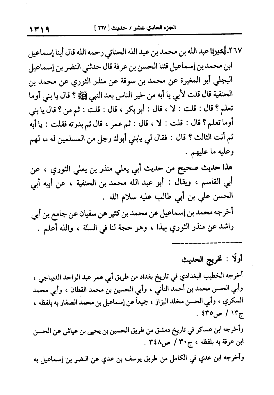 267-[276] أَخْبَرَنَا عَبْدُ اللَّهِ بْنُ مُحَمَّدِ بْنِ عَبْدِ الله الحنائي رحمه الله قال أبنا إسماعيل بن محمد بن إسماعيل قال: ثنا الحسن بن عرفة قال حدثني النضر بن إسماعيل البجلي أبو المغيرة عن محمد بن سوقة عن منذر الثوري عن محمد ابن الحنفية قال قلت لأبي يا أبة من خير الناس بعد النبي صلى الله عليه وسلم؟ قال يا بني أوما تعلم؟ قال: قلت: لا، قال: أبو بكر، قال: قلت: ثم من؟ قال يا بني أو ما تعلم؟ قال: قلت: لا، قال: ثم عمر، قال ثم بدرته فقلت: يا أبه ثم أنت الثالث؟ قال: فقال لي يا بني أبوك رجل من المسلمين له ما لهم وعليه ما عليهم.