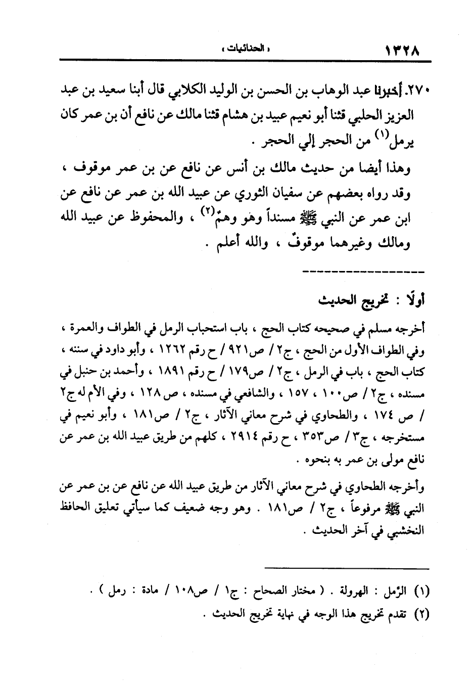270-[279] أَخْبَرَنَا عَبْدُ الْوَهَّابِ بْنُ الْحَسَنِ بْنِ الْوَلِيدِ الْكِلَابِيُّ قال أبنا سعيد بن عبد العزيز الحلبي قال: ثنا أبو نعيم عبيد بن هشام قال: ثنا مالك عن نافع أن ابن عمر كان يرمل من الحجر إلى الحجر.