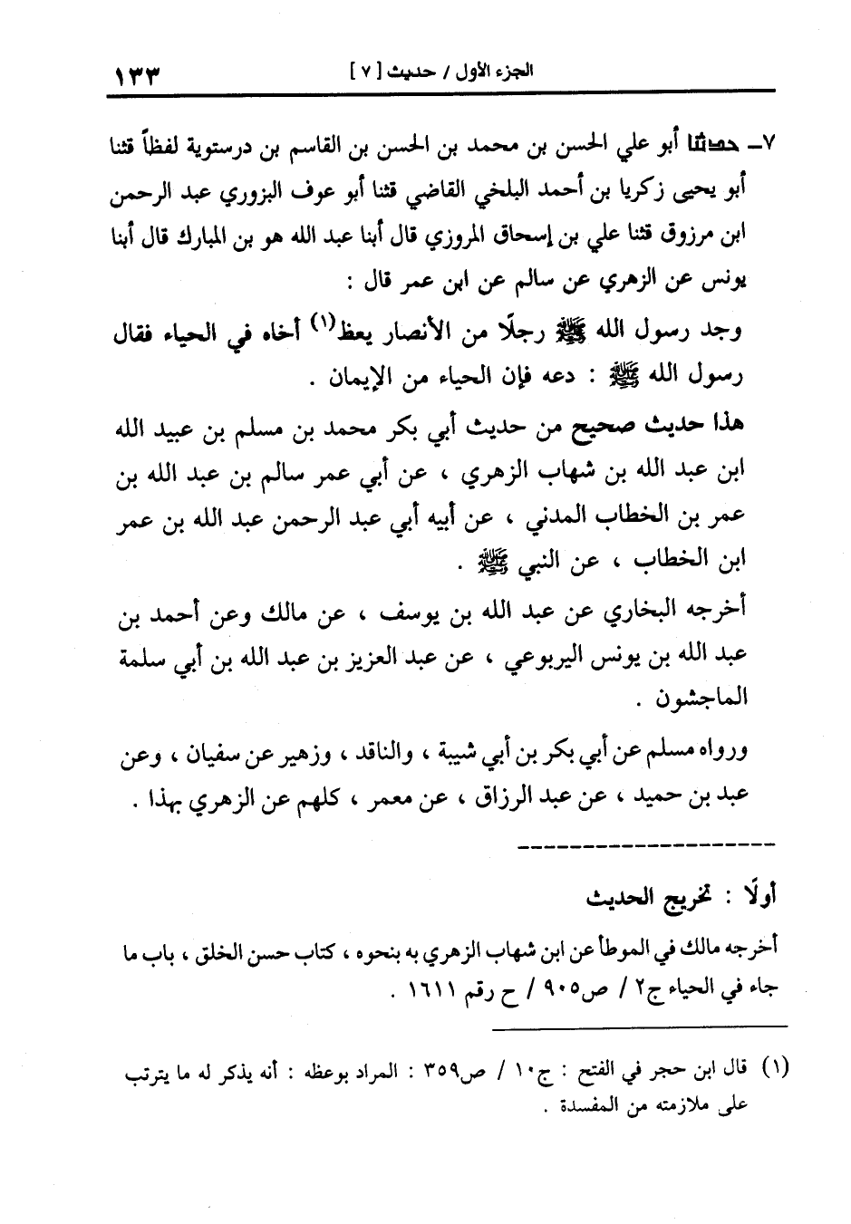 7- حَدَّثَنَا أَبُو عَلِيٍّ الْحَسَنُ بْنُ مُحَمَّدِ بْنِ الْحَسَنِ بن القاسم بن درستوية لفظا قال: ثنا أَبُو يَحْيَى زَكَرِيَّا بْنُ أَحْمَدَ الْبَلْخِيُّ الْقَاضِيُ قال: ثنا أَبُو عَوْفٍ الْبُزُورِيُّ عَبْدُ الرَّحْمَنِ بْنُ مَرْزُوقٍ قال: ثنا علي بن إسحاق المروزي قال أبنا عبد الله هو ابن المبارك قال أبنا يُونُسُ عَنِ الزُّهْرِيِّ عَنْ سَالِمٍ عَنِ ابْنِ عُمَرَ قَالَ: وَجَدَ رَسُولُ اللَّهِ صَلَّى اللَّهُ عَلَيْهِ وَسَلَّمَ رَجُلًا مِنَ الْأَنْصَارِ يَعِظُ أَخَاهُ فِي الْحَيَاءِ فَقَالَ رَسُولُ اللَّهِ صَلَّى اللَّهُ عَلَيْهِ وَسَلَّمَ: دَعْهُ فَإِنَّ الْحَيَاءَ مِنَ الْإِيمَانِ.