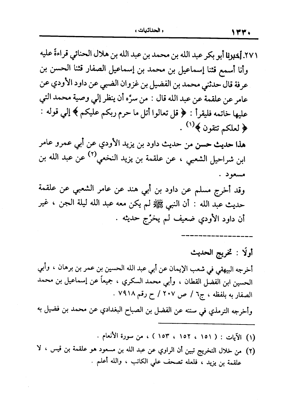 271-[280] أَخْبَرَنَا أَبُو بَكْرٍ عَبْدُ اللَّهِ بْنُ مُحَمَّدِ بْنِ عَبْدِ اللَّهِ بْنِ هِلَالٍ الْحِنَّائِيُّ قِرَاءَةً عليه وأنا أسمع قال: ثنا إِسْمَاعِيلُ بْنُ مُحَمَّدِ بْنِ إِسْمَاعِيلَ الصَّفَّارُ قال: ثنا الحسن بن عرفة قال حدثني محمد بن الفضيل بن غزوان الضبي عن داود الأودي عن عامر عن علقمة عن عبد الله قال: من سره أن ينظر إلى وصية محمد التي عليها خاتمه فليقرأ {قل تعالوا أتل ما حرم ربكم عليكم} إلى قوله {لعلكم تتقون} .