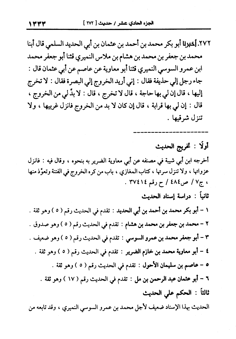 272-[281] أَخْبَرَنَا أَبُو بَكْرٍ مُحَمَّدُ بْنُ أَحْمَدَ بْنِ عثمان بن أبي الحديد السلمي قال أبنا مُحَمَّدُ بْنُ جَعْفَرِ بْنِ مُحَمَّدِ بْنِ هِشَامِ بن ملاس النميري قال: ثنا أَبُو جَعْفَرٍ مُحَمَّدُ بْنُ عَمْرٍو السُّوسيُ النُّمَيْرِيُّ قال: ثنا أبو معاوية عن عاصم عن أبي عثمان قال: جاء رجل إلى حذيفة فقال: إني أريد الخروج إلى البصرة فقال: لا تخرج إليها قال إن لي بها حاجة قال لا تخرج قال: لا بد لي من الخروج قال: إن لي بها قرابة قال إن كان لا بد من الخروج فانزل غربيها ولا تنزل شرقيها.