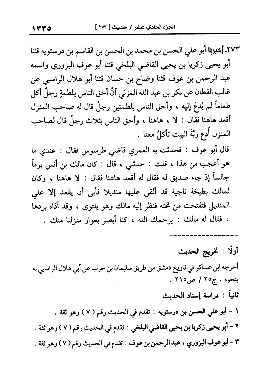273-[282] أخبرنا أَبُو عَلِيٍّ الْحَسَنُ بْنُ مُحَمَّدِ بْنِ الْحَسَنِ بن القاسم بن درستويه قال: ثنا أبو يحيى زكريا بن يحيى القاضي البلخي قال: ثنا أبو عوف البزوري واسمه عبد الرحمن بن عوف قال: ثنا وضاح بن حسان قال: ثنا أبو هلال الراسبي عن غالب القطان عن بكر بن عبد الله المزني أن أحق الناس بلطمة رجل أكل طعاما لم يدع إليه وأحق الناس بلطمتين رجل قال له صاحب المنزل أقعد هاهنا فقال: لا هاهنا وأحق الناس بثلاث رجل قال لصاحب المنزل أدع ربة البيت تأكل معنا.