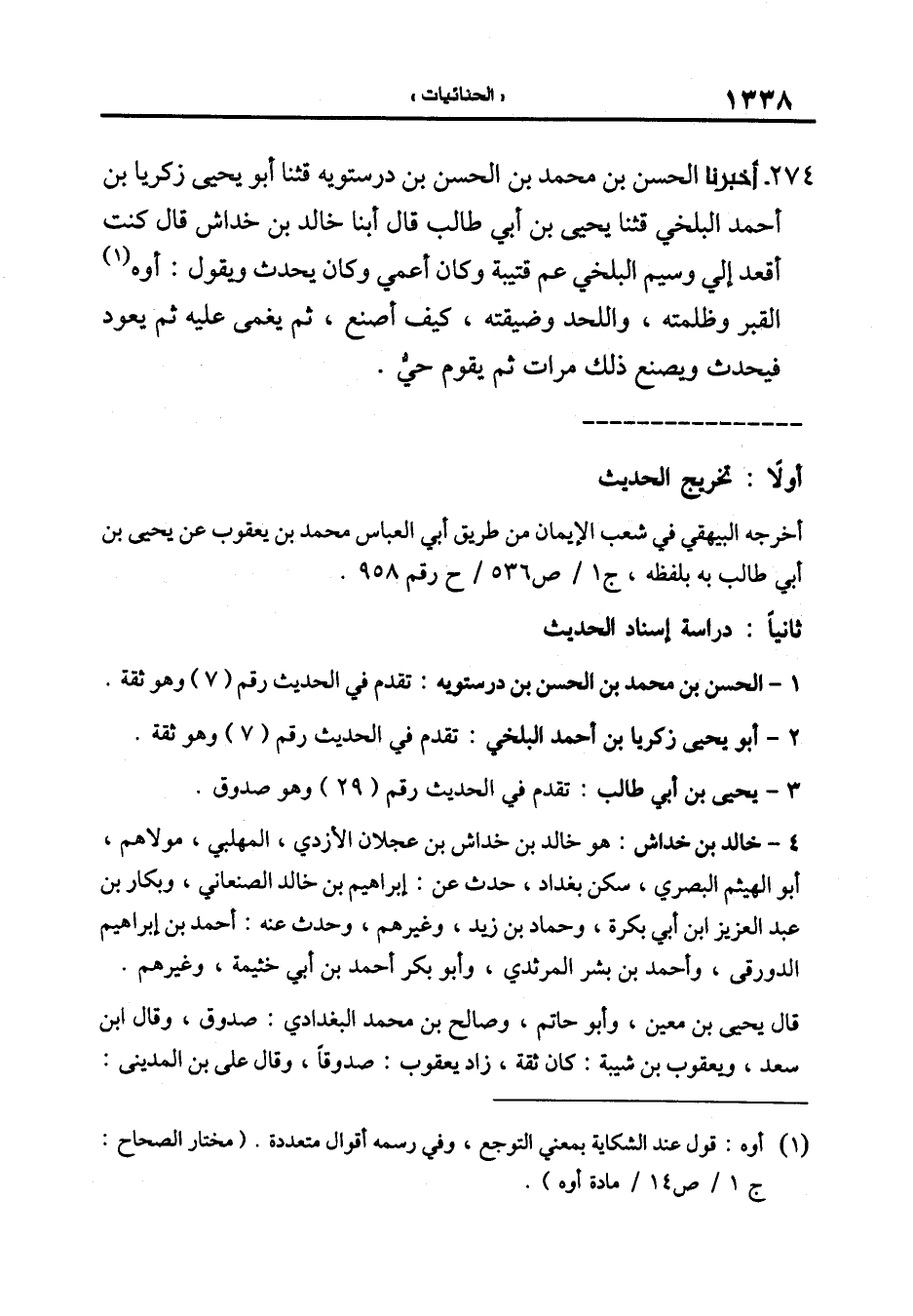 274-[283] أخبرنا الْحَسَنُ بْنُ مُحَمَّدِ بْنِ الْحَسَنِ بْنِ دَرَسْتَوَيْهِ قال: ثنا أبو يحيى زكريا بن أحمد البلخي قال: ثنا يحيى بن أبي طالب قال أبنا خالد بن خداش قال كنت أقعد إلى وسيم البلخي عم قتيبة وكان أعمى وكان يحدث ويقول: أوه القبر وظلمته واللحد وضيقته كيف أصنع ثم يغمى عليه ثم يعود فيحدث ويصنع ذلك مرات ثم يقوم حي.