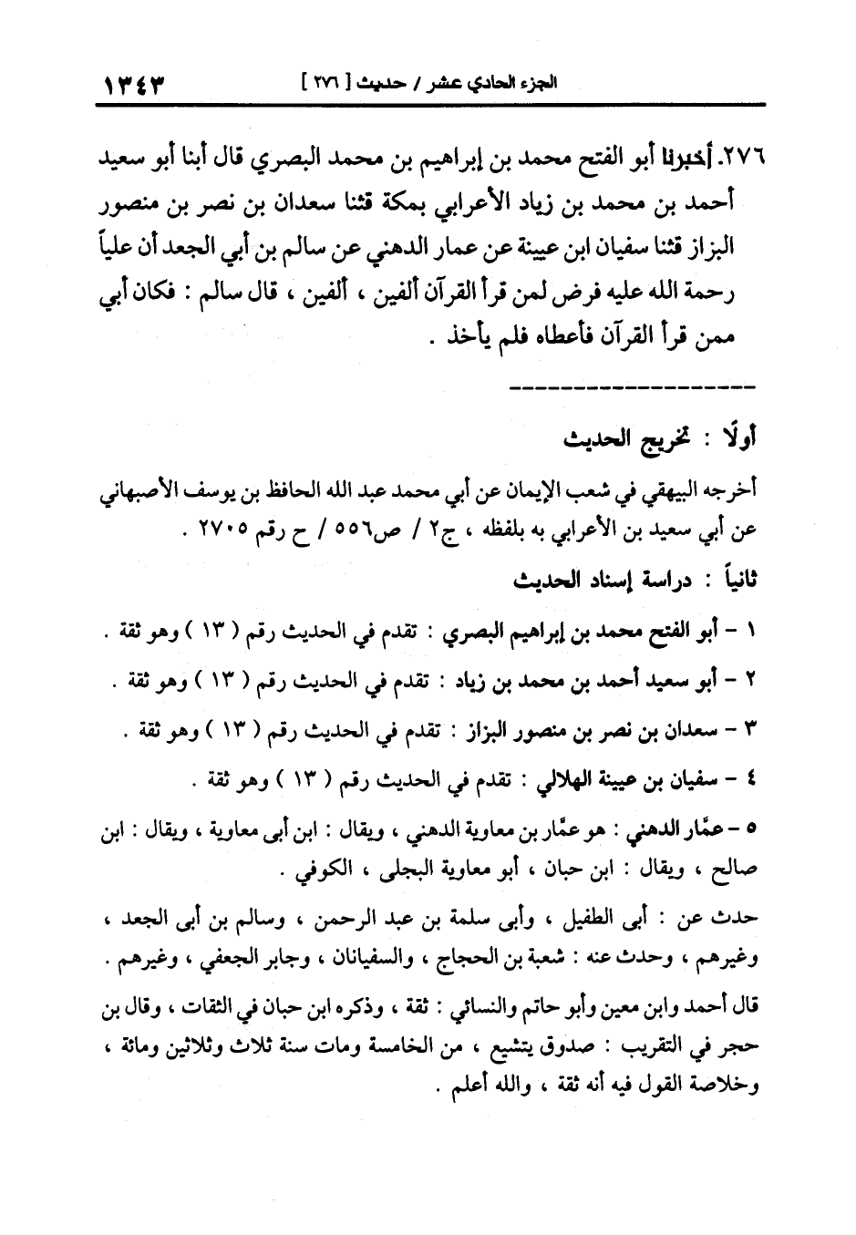 276-[285] أَخْبَرَنَا أَبُو الْفَتْحِ مُحَمَّدُ بْنُ إِبْرَاهِيمَ بْنِ محمد البصري قال أبنا أَبُو سَعِيدٍ أَحْمَدُ بْنُ مُحَمَّدِ بْنِ زِيَادٍ الأَعْرَابِيَّ بمكة قال: ثنا سعدان بن نصر بن منصور البزاز قال: ثنا سفيان بن عيينة عن عمار الدهني عن سالم بن أبي الجعد أن عليا رحمة الله عليه فرض لمن قرأ القرآن ألفين ألفين قال سالم: فكان أبي ممن قرأ القرآن فأعطاه فلم يأخذ.
