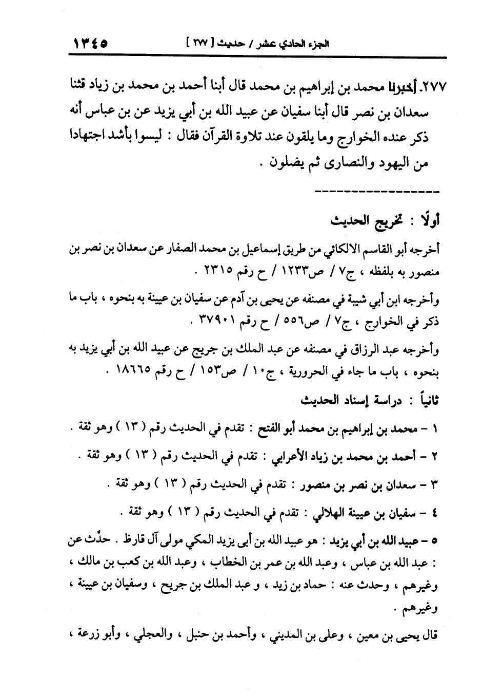 277-[286] أخبرنا محمد بن إبراهيم بن محمد قال أبنا أحمد بن محمد بن زياد قال: ثنا سعدان بن نصر قال أبنا سفيان عن عبيد الله بن أبي يزيد عن ابن عباس أنه ذكر عنده الخوارج وما يلقون عند تلاوة القرآن فقال: ليسوا بأشد اجتهادا من اليهود والنصارى ثم يضلون.