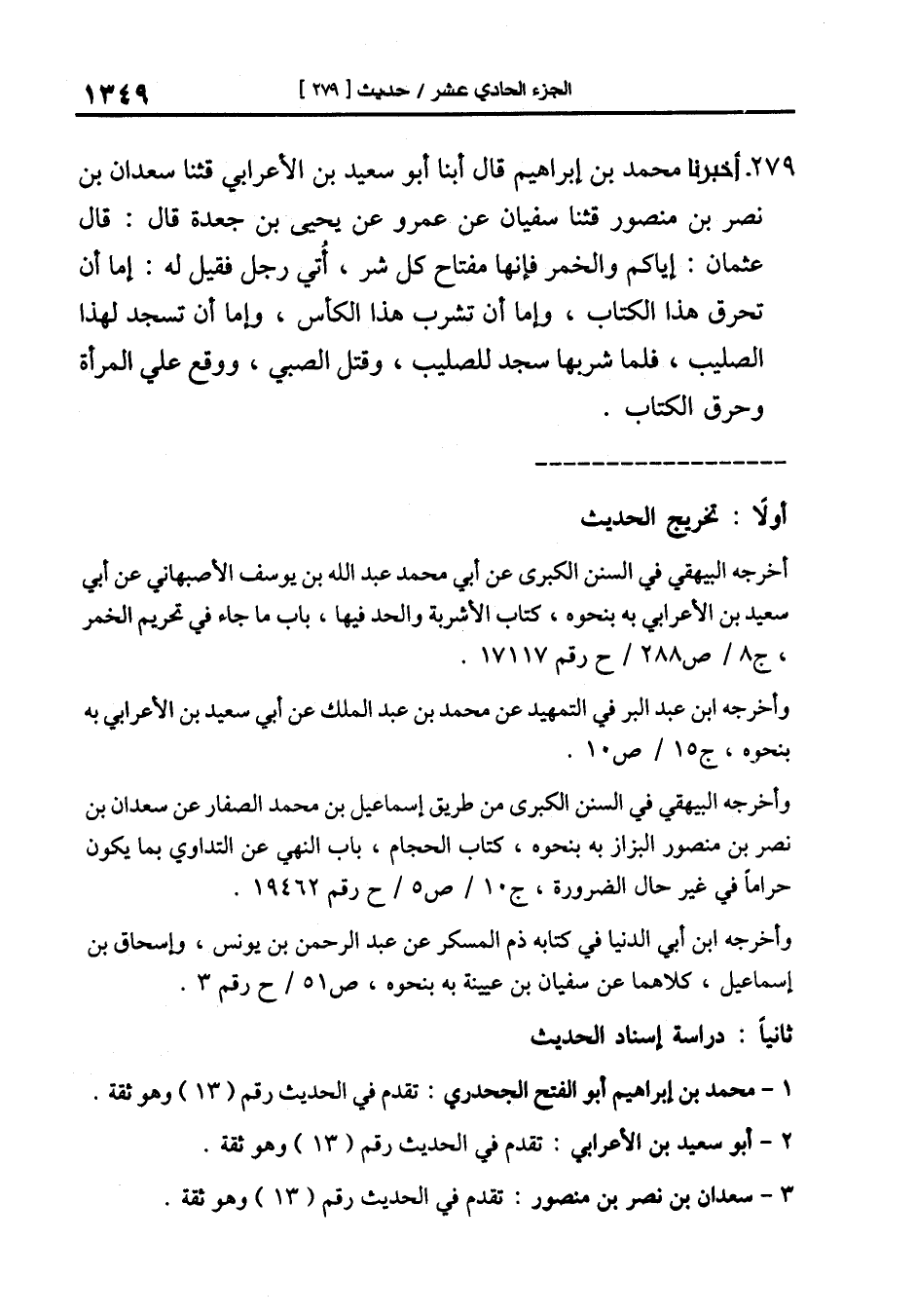 279-[288] أخبرنا محمد بن إبراهيم قال أبنا أبو سعيد بن الأعرابي قال: ثنا سعدان بن نصر بن منصور قال: ثنا سفيان عن عمرو عن يحيى بن جعدة قال: قال عثمان: إياكم والخمر فإنها مفتاح كل شر أتي رجل فقيل له: إما أن تحرق هذا الكتاب وإما أن تشرب هذا الكأس وإما أن تسجد لهذا الصليب فلما شربها سجد للصليب وقتل الصبي ووقع على المرأة وحرق الكتاب.