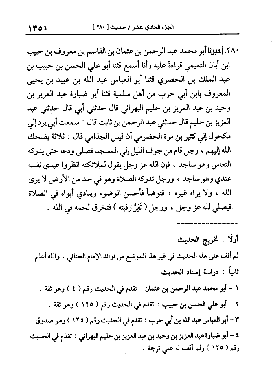 280-[289] أَخْبَرَنَا أَبُو مُحَمَّدٍ عَبْدُ الرَّحْمَنِ بْنُ عُثْمَانَ بْنِ الْقَاسِمِ بْنِ مَعْرُوفِ بْنِ حَبِيبِ بْنِ أَبَانٍ التَّمِيمِيُّ قِرَاءَةً عَلَيْهِ وَأَنَا أَسْمَعُ قَالَ: ثنا أَبُو عَلِيٍّ الْحَسَنُ بْنُ حَبِيبِ بْنِ عَبْدِ الملك بن الحصري قال: ثنا أبو العباس عبد الله بن عبيد بْنُ يَحْيَى الْمَعْرُوفُ بِابْنِ أَبِي حَرْبٍ مِنْ أهل سلمية قال: ثنا أَبُو ضَبَارَةَ عَبْدُ الْعَزِيزِ بْنُ وَحِيدِ بْنِ عبد العزيز بن حليم الْبَهْرَانِيُّ قَالَ حَدَّثَنِي أَبِي قَالَ حَدَّثَنِي عَبْدُ العزيز بن حليم قَالَ حَدَّثَنِي عَبْدُ الرَّحْمَنِ بْنُ ثَابِتٍ قَالَ: سمعت أبي يرد إلى مكحول إلى كثير بن مرة الحضرمي أن قيس الجذامي قال: ثلاثة يضحك الله إليهم رجل قام من جوف الليل إلى المسجد فصلى ودعا حتى يدركه النعاس وهو ساجد فإن الله عز وجل يقول لملائكته انظروا عبدي نفسه عندي وهو ساجد، ورجل تدركه الصلاة وهو في حد من الأرض لا يراه إلا الله (¬1) ولا يراه غيره فتوضأ فأحسن الوضوء وينادي أبواه في الصلاة فيصلي لله عز وجل ورجل (تفر رفيته) (¬2) فتخرق لحمه في الله.
