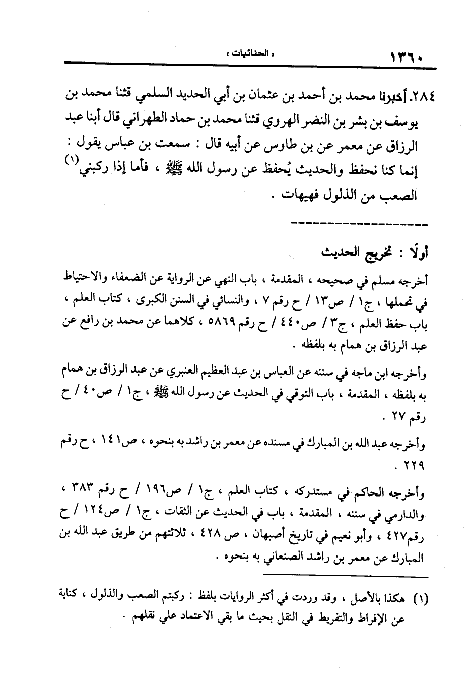284-[293] أَخْبَرَنَا مُحَمَّدُ بْنُ أَحْمَدَ بْنِ عُثْمَانَ بْنِ أَبِي الحديد السلمي قال: ثنا مُحَمَّدُ بْنُ يُوسُفَ بْنِ بِشْرِ بْنِ النَّضْرِ الهروي قال: ثنا محمد بن حماد الطهراني قال أبنا عبد الرزاق عن معمر عن ابن طَاوُسٍ عَنْ أَبِيهِ قَالَ: سَمِعْتُ ابْنَ عَبَّاسٍ يقول: إنما كنا نحفظ والحديث يحفظ عَنْ رَسُولِ اللَّهِ صَلَّى اللَّهُ عَلَيْهِ وَسَلَّمَ فأما إذا ركبنى الصعب من الذلول فهيهات.