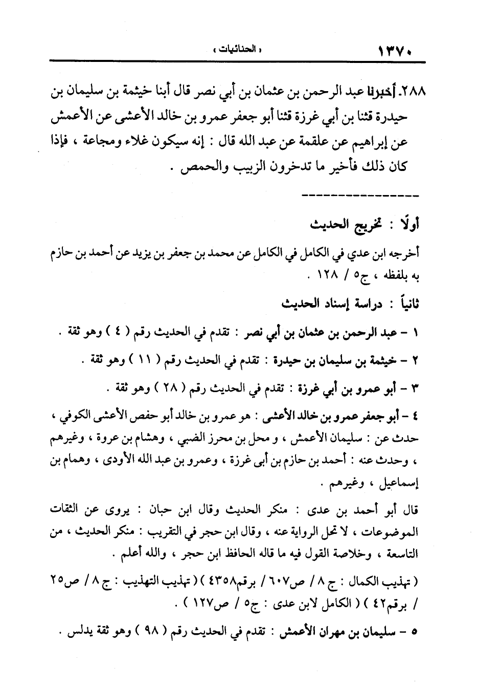 288-[297] أَخْبَرَنَا عَبْدُ الرَّحْمَنِ بْنُ عُثْمَانَ بْنِ أَبِي نصر قال أبنا خيثمة بن سليمان بن حيدرة قال: ثنا ابن أبي غرزة قال: ثنا أبو جعفر عمرو بن خالد الأعشى عن الأعمش عن إبراهيم عن علقمة عن عبد الله قال: إنه سيكون غلاء ومجاعة فإذا كان ذلك فأخير ما تدخرون الزبيب والحمص.