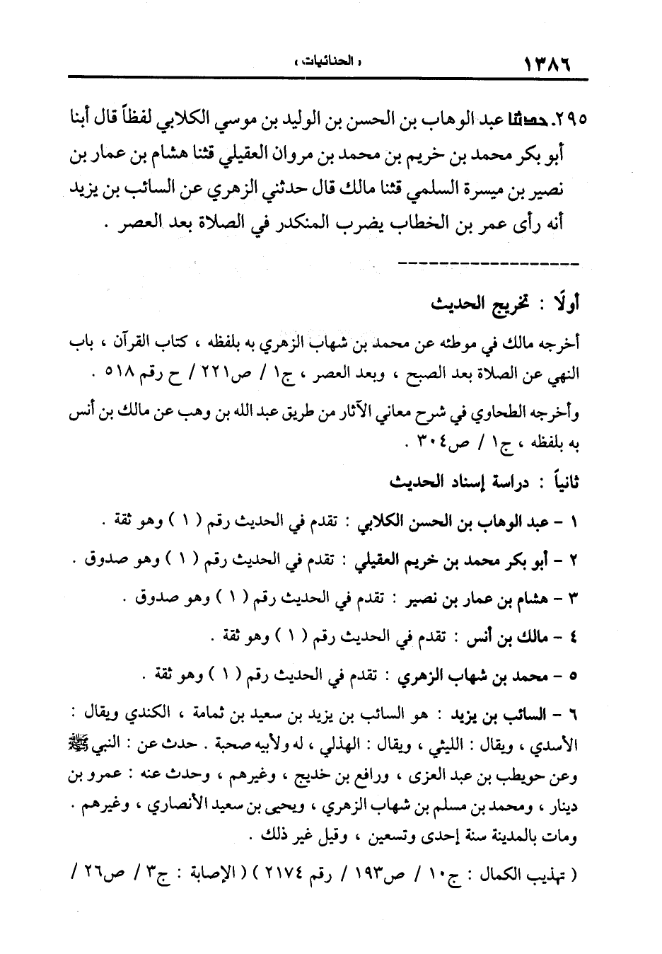 295-[304] حَدَّثَنَا عَبْدُ الْوَهَّابِ بْنُ الْحَسَنِ بْنِ الْوَلِيدِ بْنِ موسى الكلابي لفظا قال أبنا أَبُو بَكْرٍ مُحَمَّدُ بْنُ خُرَيْمِ بْنِ مُحَمَّدِ بن مروان العقيلي قال: ثنا هِشَامُ بْنُ عَمَّارِ بْنِ نُصَيْرِ بْنِ مَيْسَرَةَ السلمي قال: ثنا مالك قال حدثني الزهري عن السائب بن يزيد أنه رأى عمر بن الخطاب يضرب المنكدر في الصلاة بعد العصر.