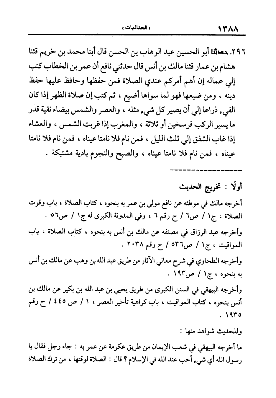 296-[305] حَدَّثَنَا أَبُو الْحُسَيْنِ عَبْدُ الْوَهَّابِ بْنُ الْحَسَنِ قال أبنا محمد بن خريم قال: ثنا هشام بن عمار قال: ثنا مالك بن أنس قال حدثني نافع أن عمر بن الخطاب كتب إلى عماله إن أهم أمركم عندي الصلاة فمن حفظها وحافظ عليها حفظ دينه ومن ضيعها فهو لما سواها أضيع ثم كتب إن صلاة الظهر إذا كان الفئ ذراعا إلى أن يصير كل شيء مثله والعصر والشمس بيضاء نقية قدر ما يسير الركب فرسخين أو ثلاثة والمغرب إذا غربت الشمس والعشاء إذا غاب الشفق إلى ثلث الليل فمن نام فلا نامتا عيناه فمن نام فلا نامتا عيناه فمن نام فلا نامتا عيناه والصبح والنجوم بادية مشتبكة.
