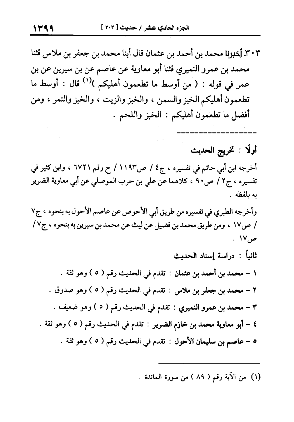 303-[312] أخبرنا محمد بن أحمد بن عثمان قال أبنا محمد بن جعفر بن ملاس قال: ثنا محمد بن عمرو النميري قال: ثنا أبو معاوية عن عاصم عن ابن سيرين عن ابن عمر في قوله {من أوسط ما تطعمون أهليكم} قال: أوسط ما تطعمون أهليكم الخبز والسمن والخبز والزيت والخبز والتمر ومن أفضل ما تطعمون أهليكم: الخبز واللحم.