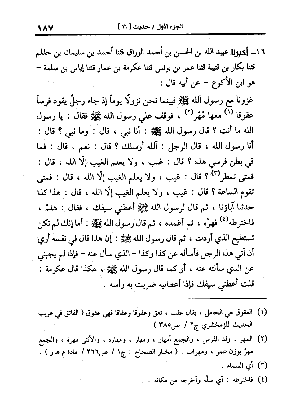 16- أَخْبَرَنَا عُبَيْدُ اللَّهِ بْنُ الْحَسَنِ بْنِ أَحْمَدَ الْوَرَّاقُ قال: ثنا أحمد بن سليمان بن حذلم قال: ثنا بكار بن قتيبة قال: ثنا عمر بن يونس قال: ثنا عكرمة بن عمار قال: ثنا إِيَاسُ بْنُ سَلَمَةَ هُوَ ابْنُ الْأَكْوَعِ عَنْ أَبِيهِ قَالَ: غَزَوْنَا مَعَ رَسُولِ اللَّهِ صَلَّى اللَّهُ عَلَيْهِ وَسَلَّمَ فبينما نحن نزولا يَوْمًا إِذْ جَاءَ رَجُلٌ يَقُودُ فَرَسًا عَقُوقًا مَعَهَا مُهْرٌ فَوَقَفَ عَلَى رَسُولِ اللَّهِ صَلَّى اللَّهُ عَلَيْهِ وَسَلَّمَ فَقَالَ: يا رَسُولَ اللَّهِ مَا أَنْتَ؟ قَالَ رَسُولُ اللَّهِ صَلَّى اللَّهُ عَلَيْهِ وَسَلَّمَ: أَنَا نَبِيٌّ، قَالَ: وَمَا نَبِيٌّ؟ قَالَ: أَنَا رَسُولُ اللَّهِ قَالَ الرَّجُلُ: اللَّهُ أَرْسَلَكَ؟ قَالَ: نَعَمْ قَالَ: فَمَا فِي بَطْنِ فَرَسِي هَذِهِ؟ قَالَ: غَيْبٌ وَلَا يَعْلَمُ الْغَيْبَ إِلَّا اللَّهُ قَالَ: فَمَتَى تُمْطِرُ؟ قَالَ: غَيْبٌ وَلَا يَعْلَمُ الْغَيْبَ إِلَّا اللَّهُ قَالَ: فَمَتَى تَقُومُ السَّاعَةُ؟ قَالَ: غَيْبٌ وَلَا يَعْلَمُ الْغَيْبَ إلا الله قال: هذا كذا حدثنا آباؤنا ثُمّ قَالَ لِرَسُولِ اللَّهِ صَلَّى اللَّهُ عَلَيْهِ وَسَلَّمَ أَعْطِنِي سَيْفَكَ فَقَالَ: هَلُمَّ فَاخْتَرَطَهُ فَهَزَّهُ ثُمَّ أَغْمَدَهُ ثُمَّ قَالَ رَسُولُ اللَّهِ صَلَّى اللَّهُ عَلَيْهِ وَسَلَّمَ: أما إِنَّكَ لَمْ تَكُنْ تَسْتَطِيعُ الَّذِي أَرَدْتَ ثُمَّ قَالَ رَسُولُ اللَّهِ صَلَّى اللَّهُ عَلَيْهِ وَسَلَّمَ: إِنَّ هَذَا قَالَ فِي نَفْسِهِ أَرَى أَنْ آتِيَ هَذَا الرَّجُلَ فَأَسْأَلَهُ عَنْ كَذَا وَكَذَا الَّذِي سَأَلَ عَنْهُ فَإِذَا لَمْ يُجِبْنِي عَنِ الَّذِي سَأَلْتُهُ عَنْهُ أَوْ كَمَا قَالَ رَسُولُ اللَّهِ صَلَّى اللَّهُ عَلَيْهِ وَسَلَّمَ هَكَذَا قَالَ عِكْرِمَةُ: قُلْتُ أَعْطِنِي سَيْفَكَ فَإِذَا أَعْطَانِيهُ ضَرَبْتُ بِهِ رَأْسَهُ.