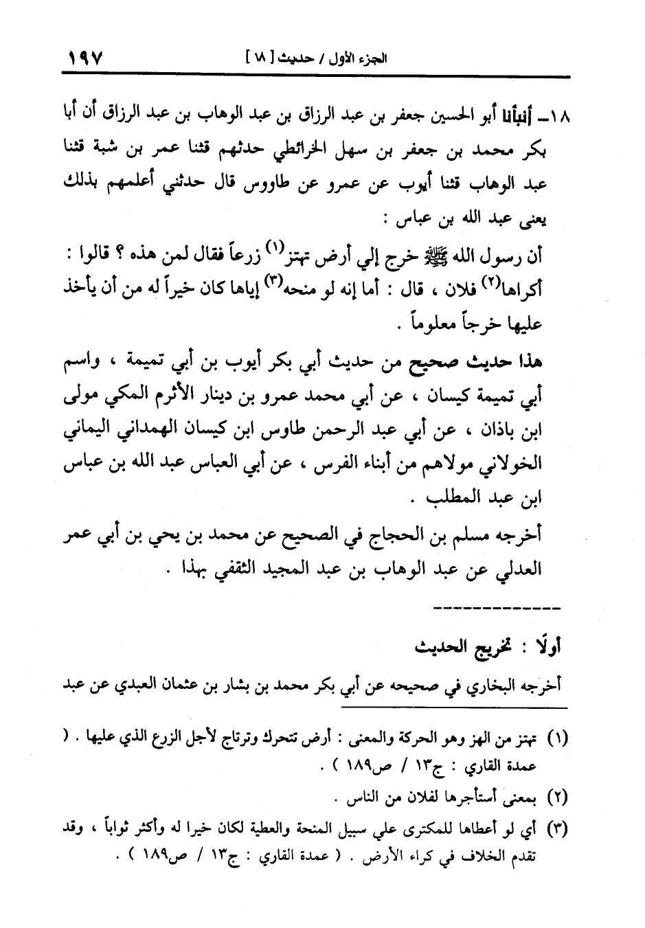 18- أنَبْأَنَا أَبُو الْحُسَيْنِ جَعْفَرُ بْنُ عَبْدِ الرَّزَّاقِ بْنِ عَبْدِ الْوَهَّابِ بْنِ عَبْدِ الرَّزَّاقِ أَنَّ أَبَا بَكْرٍ مُحَمَّدَ بْنَ جَعْفَرِ بْنِ سَهْلٍ الخرائطي حدثهم قال: ثنا عمر بن شبة قال: ثنا عبد الوهاب قال: ثنا أيوب عن عمرو عن طاووس قَالَ حَدَّثَنِي أَعْلَمُهُمْ بِذَلِكَ يَعْنِي عَبْدَ اللَّهِ بْنَ عَبَّاسٍ: أَنَّ رَسُولَ اللَّهِ صَلَّى اللَّهُ عَلَيْهِ وَسَلَّمَ خَرَجَ إِلَى أَرْضٍ تَهْتَزُّ زَرْعًا فَقَالَ لِمَنْ هَذِهِ؟ قَالُوا: أَكْرَاهَا فُلَانٌ قَالَ: أَمَا إِنَّهُ لَوْ مَنَحَهُ إِيَّاهَا كَانَ خَيْرًا لَهُ مِنْ أَنْ يَأْخُذَ عَلَيْهَا خَرَجًا مَعْلُومًا.