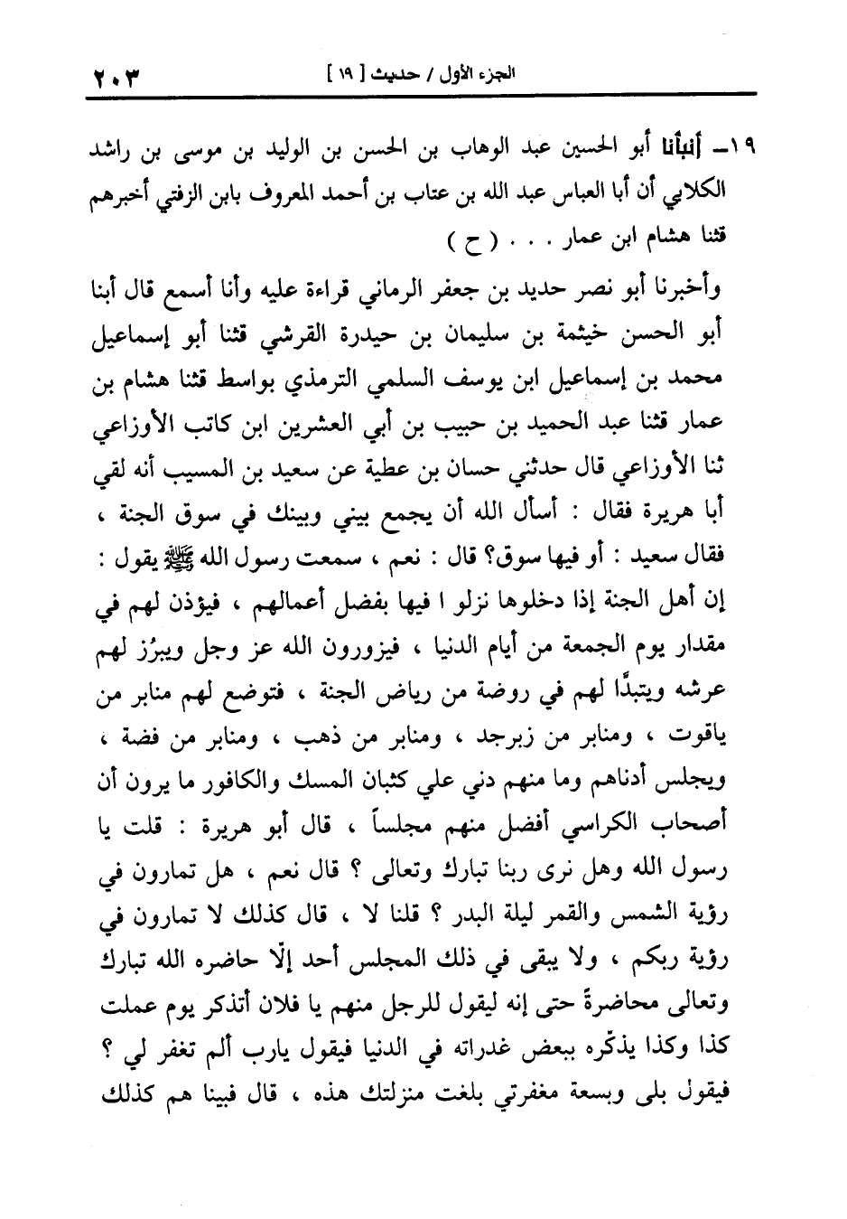وَأَخْبَرَنَا أَبُو نَصْرٍ حَدِيدُ بْنُ جَعْفَرٍ الرُّمَّانِيُّ قِرَاءَةً عَلَيْهِ وَأَنَا أَسْمَعُ قال أبنا أَبُو الْحَسَنِ خَيْثَمَةُ بْنُ سُلَيْمَانَ بْنِ حَيْدَرَةَ القرشي قال: ثنا أَبُو إِسْمَاعِيلَ مُحَمَّدُ بْنُ إِسْمَاعِيلَ بْنِ يُوسُفَ السلمي الترمذي بواسط قال: ثنا هشام بن عمار قال: ثنا عَبْدُ الْحَمِيدِ بْنُ حَبِيبِ بْنِ أَبِي الْعِشْرِينَ كاتب الأوزاعي ثنا الأوزاعي قال حَدَّثَنِي حَسَّانُ بْنُ عَطِيَّةَ عَنْ سَعِيدِ بْنِ الْمُسَيَّبِ أَنَّهُ لَقِيَ أَبَا هُرَيْرَةَ فَقَالَ [أَبُو هُرَيْرَةَ] (¬1) : اسْأَلِ اللَّهَ أَنْ يَجْمَعَ بَيْنِي وَبَيْنَكَ في سوق الجنة فقال سعيد: أو فيها سُوقٌ؟ قَالَ: نَعَمْ سَمِعْتُ رَسُولَ اللَّهِ صَلَّى اللَّهُ عَلَيْهِ وَسَلَّمَ يَقُولُ: إِنَّ أَهْلَ الْجَنَّةِ إِذَا دَخَلُوهَا نَزَلُوا فِيهَا بِفَضْلِ أَعَمَالِهِمْ فَيُؤْذَنُ لَهُمْ فِي مِقْدَارِ يَوْمِ الْجُمُعَةِ مِنْ أَيَّامِ الدُّنْيَا فَيَزُورُونَ اللَّهَ عَزَّ وَجَلَّ وَيُبْرِزُ لَهُمْ عرشه ويتبدا لَهُمْ فِي رَوْضَةٍ مِنْ رَياضِ الْجَنَّةِ فَتُوضَعُ لهم منابر مِنْ يَاقُوتٍ وَمَنَابِرُ مِنْ زَبَرْجَدٍ وَمَنَابِرُ مِنْ ذَهَبٍ وَمَنَابِرُ مِنْ فِضَّةٍ وَيَجْلِسُ أَدْنَاهُمْ وَمَا مِنْهُمْ دَنِيٌّ علَى كُثْبَانَ الْمِسْكِ وَالْكَافُورِ مَا يَرَوْنَ أَنَّ أَصْحَابَ الْكَرَاسِيِّ بِأَفْضَلَ مِنْهُمْ مَجْلِسًا قَالَ أَبُو هُرَيْرَةَ: قُلْتُ يَا رَسُولَ اللَّهِ وَهَلْ نَرَى رَبَّنَا تَبَارَكَ وَتَعَالَى؟ قَالَ نَعَمْ هل تمارون فِي رُؤْيَةِ الشَّمْسِ وَالْقَمَرِ لَيْلَةَ الْبَدْرِ؟ قُلْنَا لا قال كذلك لا تمارون فِي رُؤْيَةِ رَبِّكُمْ وَلَا يَبْقَى فِي ذَلِكَ الْمَجْلِسِ أَحَدٌ إِلَّا حَاضَرَهُ اللَّهُ تَبَارَكَ وَتَعَالَى مُحَاضَرَةً حَتَّى أَنَّهُ لَيَقُولُ لِلرَّجُلِ مِنْهُمْ يَا فُلَانُ أَتَذْكُرُ يَوْمَ عَمِلْتَ كَذَا وَكَذَا يُذَكِّرُهُ بِبَعْضِ غَدَرَاتِهِ فِي الدُّنْيَا فَيَقُولُ يَا رَبِّ أَلَمْ تَغْفِرْ لِي؟ فَيَقُولُ بَلَى وَبِسِعَةِ مَغْفِرَتِي بلغت منزلتك هذه قال فبينا هم كَذَلِكَ -[204]- عَلَى ذَلِكَ غَشِيَتْهُمْ سَحَابَةٌ مِنْ فَوْقِهِمْ فَأَمْطَرَتْ عَلَيْهِمْ طِيبًا لَمْ يَجِدُوا مِثْلَ رِيحِهِ شَيْئًا قَطُّ ثُمَّ يَقُولُ رَبُّنَا تَبَارَكَ وَتَعَالَى قُومُوا إِلَى مَا أَعْدَدْتُ لَكُمْ مِنَ الْكَرَامَةِ فَخُذُوا مَا شِئْتُمْ قَالَ: فَنَأْتِي سُوقًا قَدْ حفت به الملائكة فيه مالم تَنْظُرِ الْعُيُونُ إِلَى مِثْلِهِ وَلَمْ تَسْمَعِ الْآذَانُ ولم تخطر عَلَى الْقُلُوبِ قَالَ: فَيُحْمَلُ لَنَا مَا اشْتَهَيْنَا لَيْسَ يُبَاعُ فِيهَا شَيْءٌ وَلَا يُشْتَرَى فِي ذَلِكَ السُّوقِ يَلْقَى أَهْلُ الْجَنَّةِ بَعْضُهُمْ بَعْضًا قَالَ: فَيُقْبِلُ الرَّجُلُ ذُو الْمَنْزِلَةِ الْمُرْتَفِعَةِ فَيَلْقَى مَنْ هُوَ دُونَهُ وَمَا فِيهِمْ دَنِيٌّ فَيَرُوعُهُ مَا يَرَى عَلَيْهِ مِنَ اللِّبَاسِ وَمَا يَنْقَضِي آخِرُ حَدِيثِهِ حَتَّى يَتَمَثَّلَ عَلَيْهِ أَحْسَنَ مِنْهُ وَذَلِكَ أَنَّهُ لَا يَنْبَغِي لِأَحَدٍ أَنْ يَحْزَنَ فِيهَا قَالَ: ثُمَّ نَنْصَرِفُ إِلَى مَنَازِلِنَا فَيَتَلَقَّانَا أَزْوَاجُنَا فَيَقُلْنَ مَرْحَبًا وَأَهْلًا بِحُبِّنَا لَقَدْ جِئْتَ وَإِنَّ بِكَ مِنَ الْجَمَالِ وَالطِّيبِ أَفْضَلَ مَا فَارَقْتَنَا عَلَيْهِ قَالَ: فَيَقُولُ إِنَّا جَالَسْنَا الْيَوْمَ رَبَّنَا الْجَبَّارَ تَبَارَكَ وَتَعَالَى وَبِحَقِّنَا أَنْ نَنْقَلِبَ بِمِثْلِ مَا انْقَلَبْنَا بِهِ.