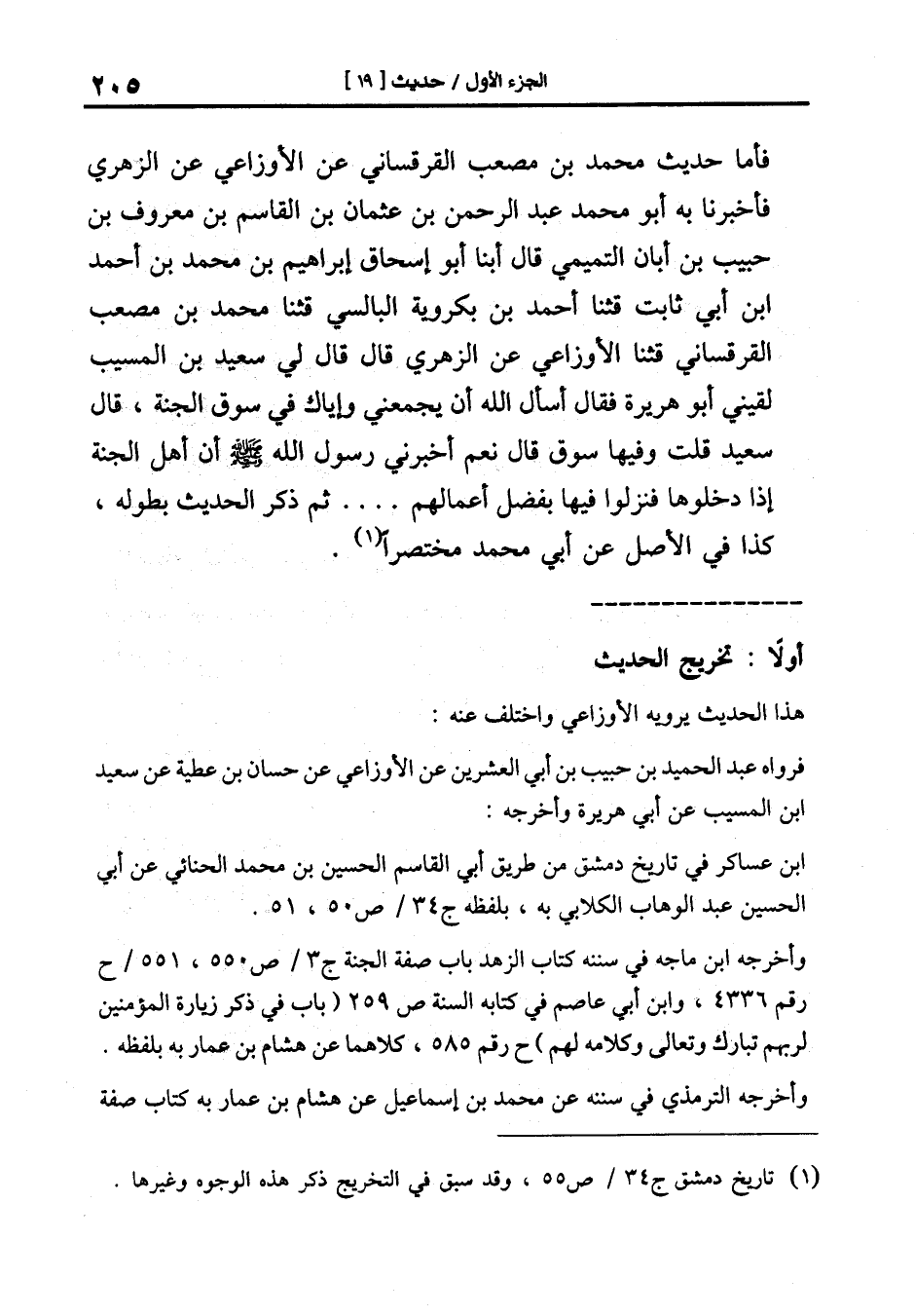 [20] فَأَخْبَرَنَا بِهِ أَبُو مُحَمَّدٍ عَبْدُ الرَّحْمَنِ بْنُ عُثْمَانَ بْنِ الْقَاسِمِ بْنِ مَعْرُوفِ بْنِ حَبِيبِ بْنِ أَبَانٍ التَّمِيمِيُّ قَالَ أنبأ أَبُو إِسْحَاقَ إِبْرَاهِيمُ بْنُ مُحَمَّدِ بْنِ أَحْمَدَ بْنِ أَبِي ثابت قال: ثنا أحمد بن بكروية البالسي قال: ثنا محمد بن مصعب القرقساني قال: ثنا الْأَوْزَاعِيُّ عَنِ الزُّهْرِيِّ قَالَ قَالَ لِي سَعِيدُ بْنُ الْمُسَيَّبِ لَقِيَنِي أَبُو هُرَيْرَةَ فَقَالَ اسْأَلِ اللَّهَ أَنْ يَجْمَعَنِي وَإِيَّاكَ فِي سُوقِ الْجَنَّةِ قال سعيد قلت وفيها سُوقٌ قَالَ نَعَمْ أَخْبَرَنِي رَسُولُ اللَّهِ صَلَّى اللَّهُ عَلَيْهِ وَسَلَّمَ أَنَّ أَهَلَ الْجَنَّةِ إِذَا دَخَلُوهَا فَنَزَلُوا فِيهَا بِفَضْلِ أَعْمَالِهِمْ.. .. .. ثُمَّ ذَكَرَ الْحَدِيثَ بِطُولِهِ.