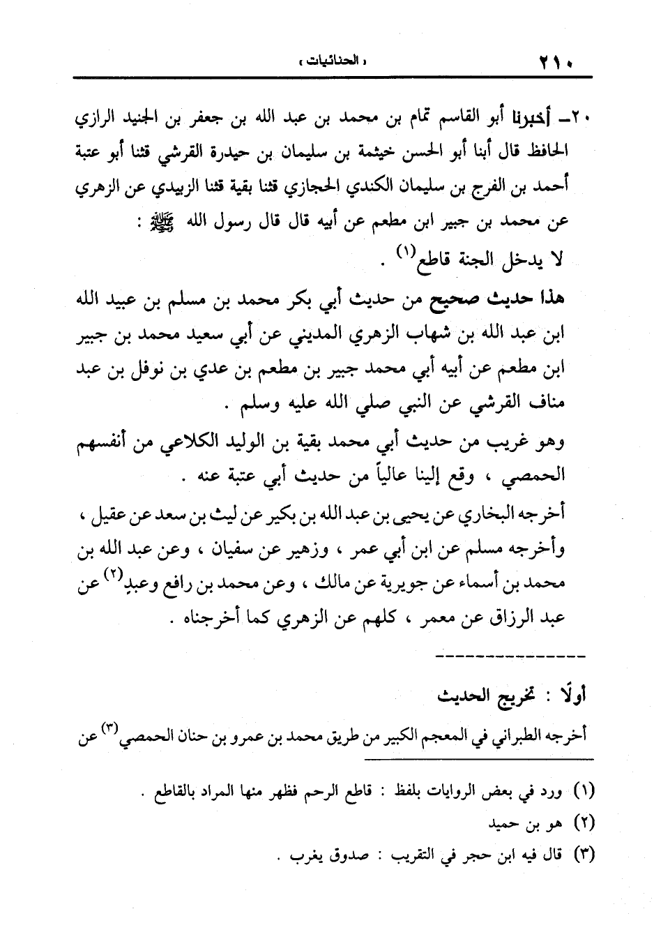 20-[21] أَخْبَرَنَا أَبُو الْقَاسِمِ تَمَّامُ بْنُ مُحَمَّدِ بْنِ عَبْدِ اللَّهِ بْنِ جَعْفَرِ بْنِ الْجُنَيْدِ الرَّازِيُّ الحافظ قال أبنا أبو الحسن بن سليمان بن خيثمة القرشي قال: ثنا أَبُو عُتْبَةَ أَحْمَدُ بْنُ الْفَرَجِ بْنِ سُلَيْمَانَ الكندي الحجازي قال: ثنا بقية قال: ثنا الزُّبَيْدِيُّ عَنِ الزُّهْرِيِّ عَنْ مُحَمَّدِ بْنِ جُبَيْرِ بْنِ مُطْعَمٍ عَنْ أَبِيهِ قَالَ قَالَ رَسُولُ اللَّهِ صَلَّى اللَّهُ عَلَيْهِ وَسَلَّمَ: لَا يَدْخُلُ الْجَنَّةَ قَاطِعٌ.