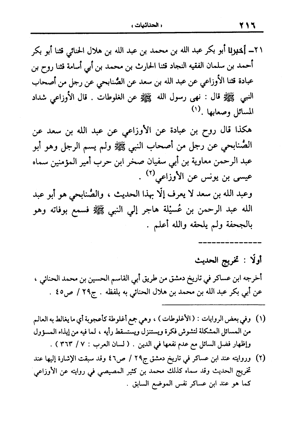 21-[22] أَخْبَرَنَا أَبُو بَكْرٍ عَبْدُ اللَّهِ بْنُ مُحَمَّدِ بْنِ عَبْدِ اللَّهِ بْنِ هِلالٍ الْحِنَّائِيُّ قَالَ: ثنا أبو بكر أحمد بن سلمان الفقيه النجاد قال: ثنا الحارث بن محمد بن أبي أسامة قال: ثنا روح بن عبادة قال: ثنا الْأَوْزَاعِيُّ عَنْ عَبْدِ اللَّهِ بْنِ سَعْدٍ عَنِ الصُّنَابِحِيِّ عَنْ رَجُلٍ مِنْ أَصْحَابِ النَّبِيِّ صَلَّى اللَّهُ عَلَيْهِ وَسَلَّمَ قَالَ: نَهَى رَسُولُ اللَّهِ صَلَّى اللَّهُ عَلَيْهِ وسلم عن الغلوطات.