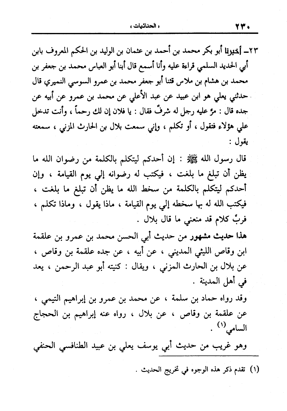 23-[24] أَخْبَرَنَا أَبُو بَكْرٍ مُحَمَّدُ بْنُ أَحْمَدَ بْنِ عُثْمَانَ بْنِ الْوَلِيدِ بْنِ الْحَكَمِ الْمَعْرُوفُ بِابْنِ أَبِي الْحَدِيدِ السُّلَمِيِّ قِرَاءَةً عَلَيْهِ وَأَنَا أَسْمَعُ قال أبنا أَبُو الْعَبَّاسِ مُحَمَّدُ بْنُ جَعْفَرِ بْنِ مُحَمَّدِ بن هشام بن ملاس قال: ثنا أَبُو جَعْفَرٍ مُحَمَّدُ بْنُ عَمْرٍو السُّوسيُ النُّمَيْرِيُّ قَالَ حَدَّثَنِي يَعْلَى هُوَ ابْنُ عُبَيْدٍ عَنْ عَبْدِ الْأَعْلَى عَنْ مُحَمَّدِ بْنِ عَمْرٍو عَنْ أَبِيهِ عَنْ جَدِّهِ قَالَ: مَرَّ عَلَيْهِ رَجُلٌ له شرف فقال: يا [أبا] (¬1) فلان إن لك رحما وأنت تدخل علي هؤلاء فتقول أو تكلم وَإِنِّي سَمِعْتُ بِلَالَ بْنَ الْحَارِثِ الْمُزَنِيَّ سَمِعْتُهُ يَقُولُ: قَالَ رَسُولُ اللَّهِ صَلَّى اللَّهُ عَلَيْهِ وَسَلَّمَ: إِنَّ أَحَدَكُمْ لَيَتَكَلَّمُ بِالْكَلِمَةِ مِنْ رِضْوَانِ اللَّهِ مَا يَظُنُّ أَنْ تَبْلُغَ مَا بَلَغَتْ فَيُكْتَبُ لَهُ رِضْوَانُهُ إِلَى يَوْمِ الْقِيَامَةِ وَإِنَّ أَحَدَكُمْ لَيَتَكَلَّمُ بِالْكَلِمَةِ مِنْ سَخَطِ اللَّهِ مَا يَظُنُّ أَنْ تَبْلُغَ مَا بَلَغَتْ فَيَكْتُبُ اللَّهُ لَهُ بِهَا سَخَطَهُ إِلَى يَوْمِ الْقِيَامَةِ