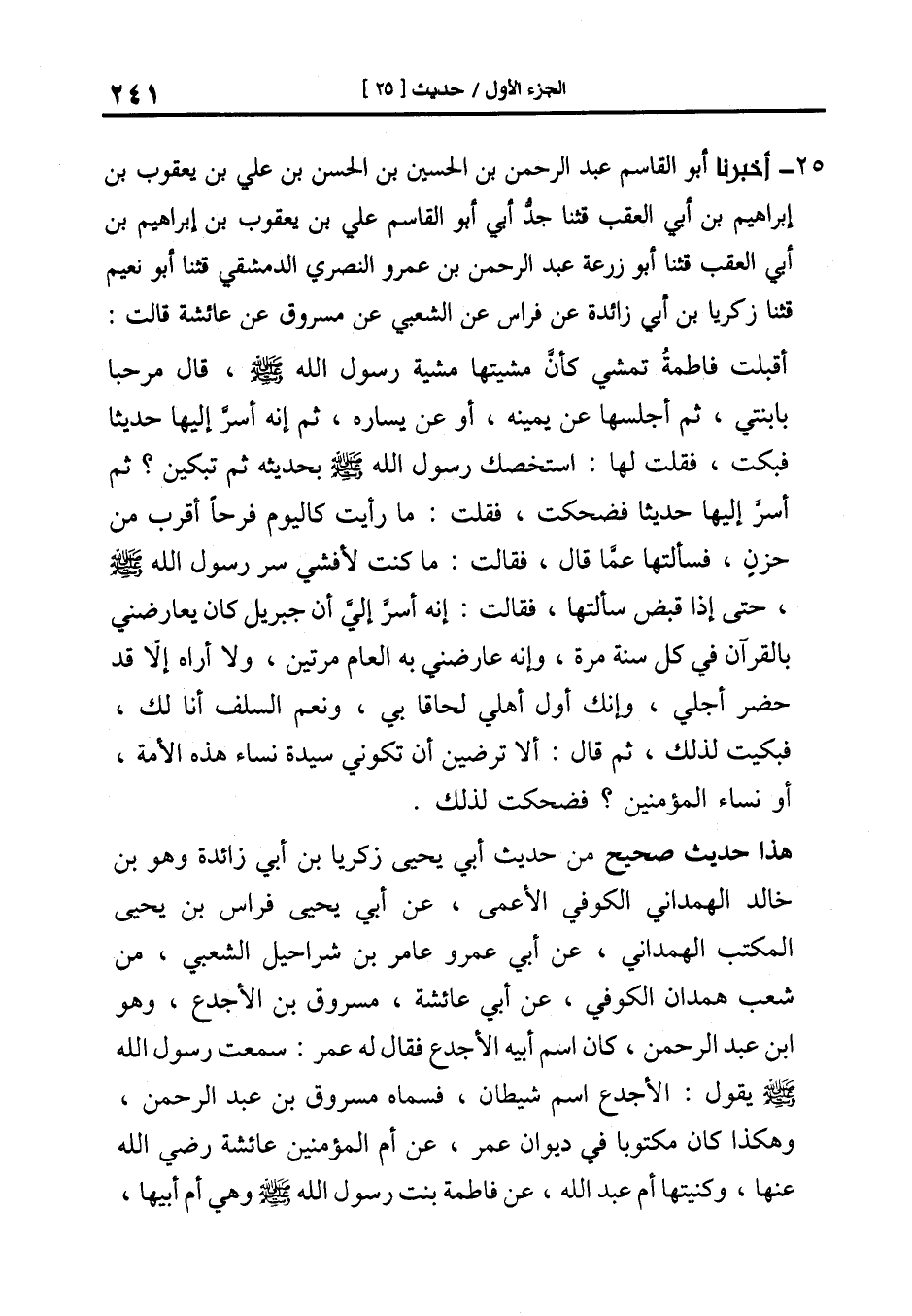 25-[26] أَخْبَرَنَا أَبُو الْقَاسِمِ عَبْدُ الرَّحْمَنِ بُنْ الْحُسَيْنِ بْنِ الْحَسَنِ بْنِ عَلِيِّ بْنِ يَعْقُوبَ بْنِ إِبْرَاهِيمَ بْنِ أَبِي العقب قال: ثنا جَدُّ أَبِي أَبُو الْقَاسِمِ عَلِيُّ بْنُ يَعْقُوبَ بْنِ إِبْرَاهِيمَ بن أبي العقب قَالَ: ثنا أَبُو زُرْعَةَ عَبْدُ الرَّحْمَنِ بْنُ عَمْرٍو النَّصْرِيُّ الدمشقي قال: ثنا أبو نعيم قال: ثنا زَكَرِيَّا بْنُ أَبِي زَائِدَةَ عَنْ فِرَاسٍ عَنِ الشَّعْبِيِّ عَنْ مَسْرُوقٍ عَنْ عَائِشَةَ قَالَتْ: أَقْبَلَتْ فَاطِمَةُ تَمْشِي كَأَنَّ مِشْيَتَهَا مِشْيَةُ رَسُولِ اللَّهِ صَلَّى اللَّهُ عَلَيْهِ وَسَلَّمَ قَالَ مَرْحَبًا بِابْنَتِي ثُمَّ أَجْلَسَهَا عَنْ يَمِينِهِ أَوْ عَنْ يَسَارِهِ ثُمَّ أَنَّهُ أَسَرَّ إِلَيْهَا حَدِيثًا فَبَكَتْ فَقُلْتُ لَهَا: اسْتَخَصَّكِ رَسُولُ اللَّهِ صَلَّى اللَّهُ عَلَيْهِ وَسَلَّمَ بِحَدِيثِهِ ثُمَّ تَبْكِينَ؟ ثُمَّ أَسَرَّ إِلَيْهَا حديثا فضحكت فقلت: ما رأيت كاليوم فَرَحًا أَقْرَبَ مِنْ حُزْنٍ فَسَأَلْتُهَا عَمَّا قَالَ فَقَالَتْ: مَا كُنْتُ لِأُفْشِيَ سِرَّ رَسُولَ اللَّهِ صَلَّى اللَّهُ عَلَيْهِ وَسَلَّمَ حَتَّى إِذَا قُبِضَ سَأَلْتُهَا فَقَالَتْ: إِنَّهُ أَسَرَّ إِلَيَّ أَنَّ جِبْرِيلَ كَانَ يُعَارِضُنِي بِالْقُرْآنِ فِي كُلِّ سَنَةٍ مَرَّةً وَأَنَّهُ عَارَضَنِي بِهِ الْعَامَ مَرَّتَيْنِ وَلَا أَرَاهُ إِلَّا قَدْ حَضَرَ أَجَلِي وَإِنَّكِ أَوَّلُ أَهْلِي لِحَاقًا بِي وَنِعْمَ السَّلَفُ أَنَا لَكِ فَبَكَيْتُ لِذَلِكَ ثُمَّ قَالَ: أَلَا تَرْضِينَ أَنْ تَكُونِي سَيِّدَةَ نِسَاءِ هَذِهِ الْأُمَّةِ أَوْ نِسَاءِ الْمُؤْمِنِينَ؟ فَضَحِكْتُ لِذَلِكَ.