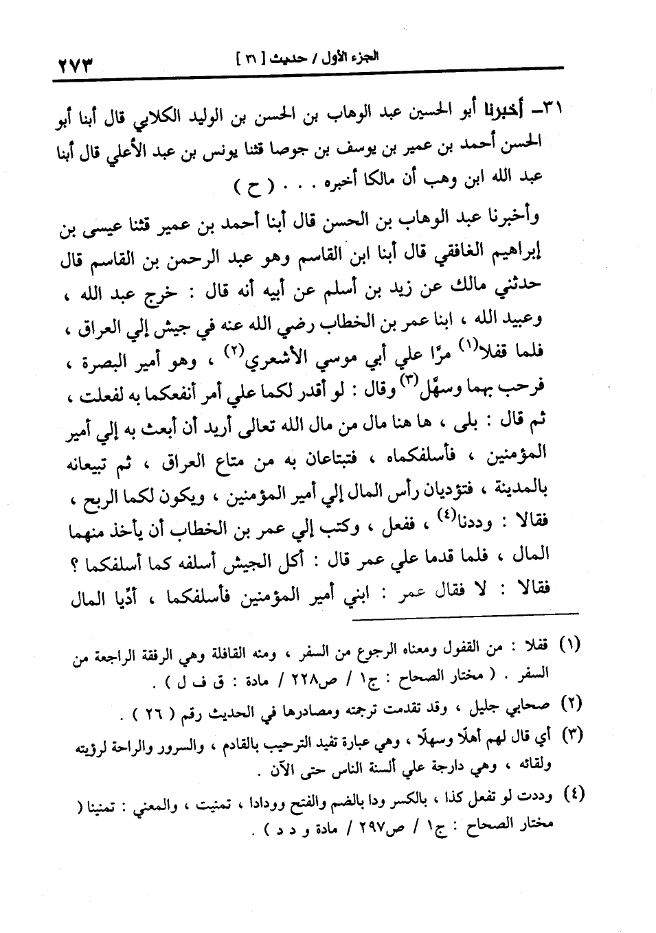 وَأَخْبَرَنَا عَبْدُ الْوَهَّابِ بْنُ الْحَسَنِ قال أبنا أحمد بن عمير قال: ثنا عيسى بن إبراهيم الغافقي قال أبنا ابْنُ الْقَاسِمِ وَهُوَ عَبْدُ الرَّحْمَنِ بْنُ الْقَاسِمِ قَالَ حَدَّثَنِي مَالِكٌ عَنْ زَيْدِ بْنِ أَسْلَمَ عَنْ أَبِيهِ أَنَّهُ قَالَ: خَرَجَ عَبْدُ اللَّهِ وَعُبَيْدُ اللَّهِ ابْنَا عُمَرَ بْنِ الْخَطَّابِ رَضِيَ اللَّهُ عَنْهُ فِي جَيْشٍ إِلَى الْعِرَاقِ فَلَمَّا قَفَلَا مَرَّا عَلَى أَبِي مُوسَى الْأَشْعَرِيِّ وَهُوَ أَمِيرُ الْبَصْرَةِ فَرَحَّبَ بِهِمَا وَسَهَّلَ وَقَالَ: لَوْ أَقْدِرُ لَكُمَا عَلَى أَمْرٍ أَنْفَعُكُمُا بِهِ لَفَعَلْتُ ثم قال: بلى ها هنا مَالٌ مِنْ مَالِ اللَّهِ تَعَالَى أُرِيدُ أَنْ أَبْعَثَ بِهِ إِلَى أَمِيرِ الْمُؤْمِنِينَ فَأُسَلِّفُكُمَاهُ فَتَبْتَاعَانِ بِهِ مِنْ مَتَاعِ الْعِرَاقِ ثُمَّ تَبِيعَانِهُ بِالْمَدِينَةِ فَتُؤَدِّيَانِ رَأْسَ الْمَالِ إِلَى أَمِيرِ الْمُؤْمِنِينَ وَيَكُونُ لَكُمَا الرِّبْحُ فَقَالَا: وَدِدْنَا فَفَعَلَ وَكَتَبَ إِلَى عمر بن الخطاب أن يأخذ منهما المال فَلَمَّا قَدِمَا عَلَى عُمَرَ قَالَ: أَكُلَّ الْجَيْشِ أَسْلَفََهُ كَمَا أَسْلَفَكُمَا؟ فَقَالَا: لَا فَقَالَ عُمَرُ: ابني أمير المؤمنين فأسلفكما أَدِّيَا الْمَالَ -[274]- وَرِبْحَهُ قَالَ: فَأَمَّا عَبْدُ اللَّهِ فَسَكَتَ وَأَمَّا عُبَيْدُ اللَّهِ فَقَالَ: مَا يَنْبَغِي لَكَ يَا أَمِيرَ الْمُؤْمِنِينَ لَوْ هَلَكَ الْمَالُ أَوْ نَقُصَ لَضَمِنَّاهُ فَقَالَ: أَدِّيَاهُ فَسَكَتَ عَبْدُ اللَّهِ وَرَاجَعَهُ عُبَيْدُ اللَّهِ فَقَالَ رَجُلٌ مِنْ جُلَسَاءِ عُمَرَ: يَا أَمِيرَ الْمُؤْمِنِينَ لَوْ جَعَلْتَه قِرَاضًا فَقَالَ عُمَرُ: قَدْ جَعَلْتُهُ قِرَاضًا فَأَخَذَ عُمَرُ رَأْسَ الْمَالِ وَنِصْفَ رِبْحِهِ وَأَخَذَ عُبَيْدُ اللَّهِ وَعَبْدُ اللَّهِ نِصْفَ رِبْحِ ذَلِكَ الْمَالِ.