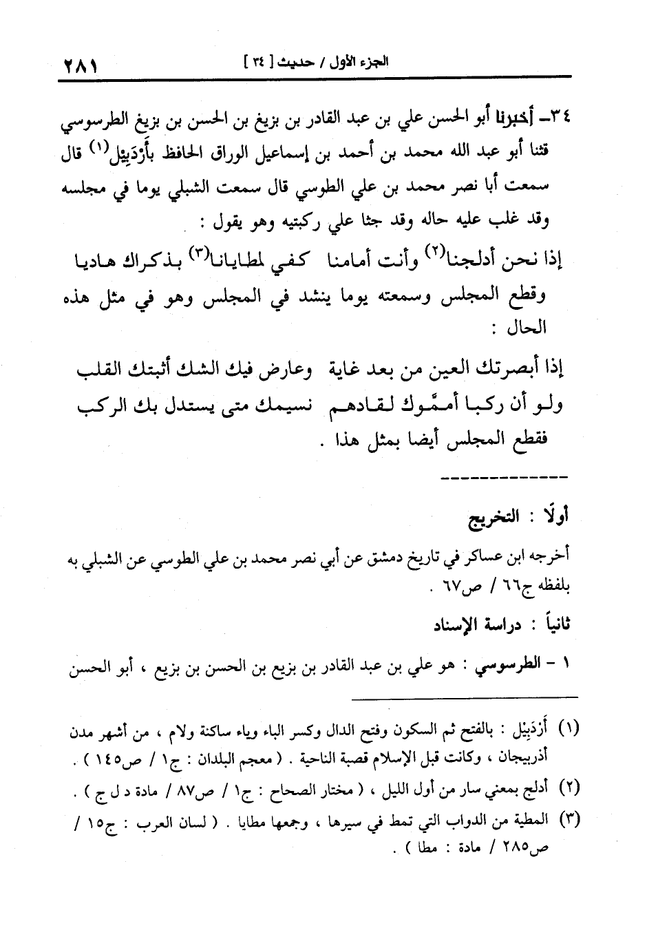 34-[35] أَخْبَرَنَا أَبُو الْحَسَنِ عَلِيُّ بْنُ عَبْدِ الْقَادِرِ بْنِ بُزَيْغِ بْنِ الْحَسَنِ بْنِ بُزَيْغٍ الطَّرَسُوسِيُّ قَالَ: ثنا أَبُو عَبْدِ اللَّهِ مُحَمَّدُ بْنُ أَحْمَدَ بْنِ إِسْمَاعِيلَ الْوَرَّاقُ الْحَافِظُ بِأَرْدَبِيلَ قَالَ سَمِعْتُ أَبَا نَصْرٍ مُحَمَّدَ بْنَ عَلِيٍّ الطُّوسِيَّ قَالَ سَمِعْتُ الشِّبْلِيَّ يُومًا فِي مَجْلِسِهِ وَقَدْ غَلَبَ عَلَيْهِ حاله وقد جثا عَلَى رُكْبَتَيْهِ وَهُوَ يَقُولُ: