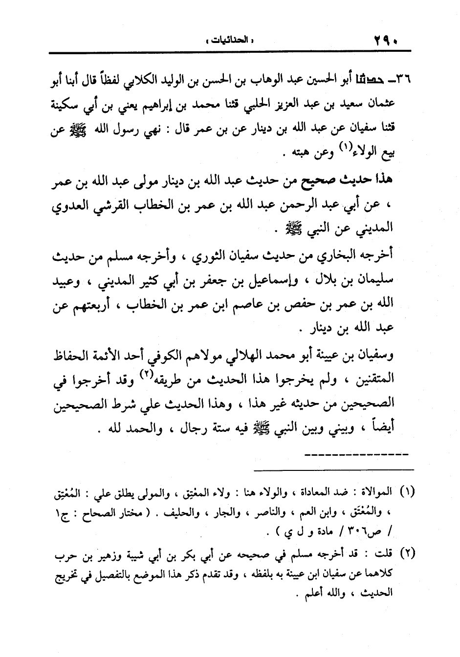 36-[37] حَدَّثَنَا أَبُو الْحُسَيْنِ عَبْدُ الْوَهَّابِ بْنُ الْحَسَنِ بْنِ الوليد الكلابي لفظا قال أبنا أَبُو عُثْمَانَ سَعِيدُ بْنُ عَبْدِ الْعَزِيزِ الْحَلَبِيُّ قال: ثنا مُحَمَّدُ بْنُ إِبْرَاهِيمَ يَعْنِي ابْنَ أَبِي سُكَيْنَةَ قال: ثنا سُفْيَانُ عَنْ عَبْدِ اللَّهِ بْنِ دِينَارٍ عَنِ ابْنِ عُمَرَ قَالَ: نَهَى رَسُولُ اللَّهِ صَلَّى اللَّهُ عَلَيْهِ وَسَلَّمَ عَنْ بَيْعِ الْوَلاءِ وَعَنْ هِبَتِهِ.