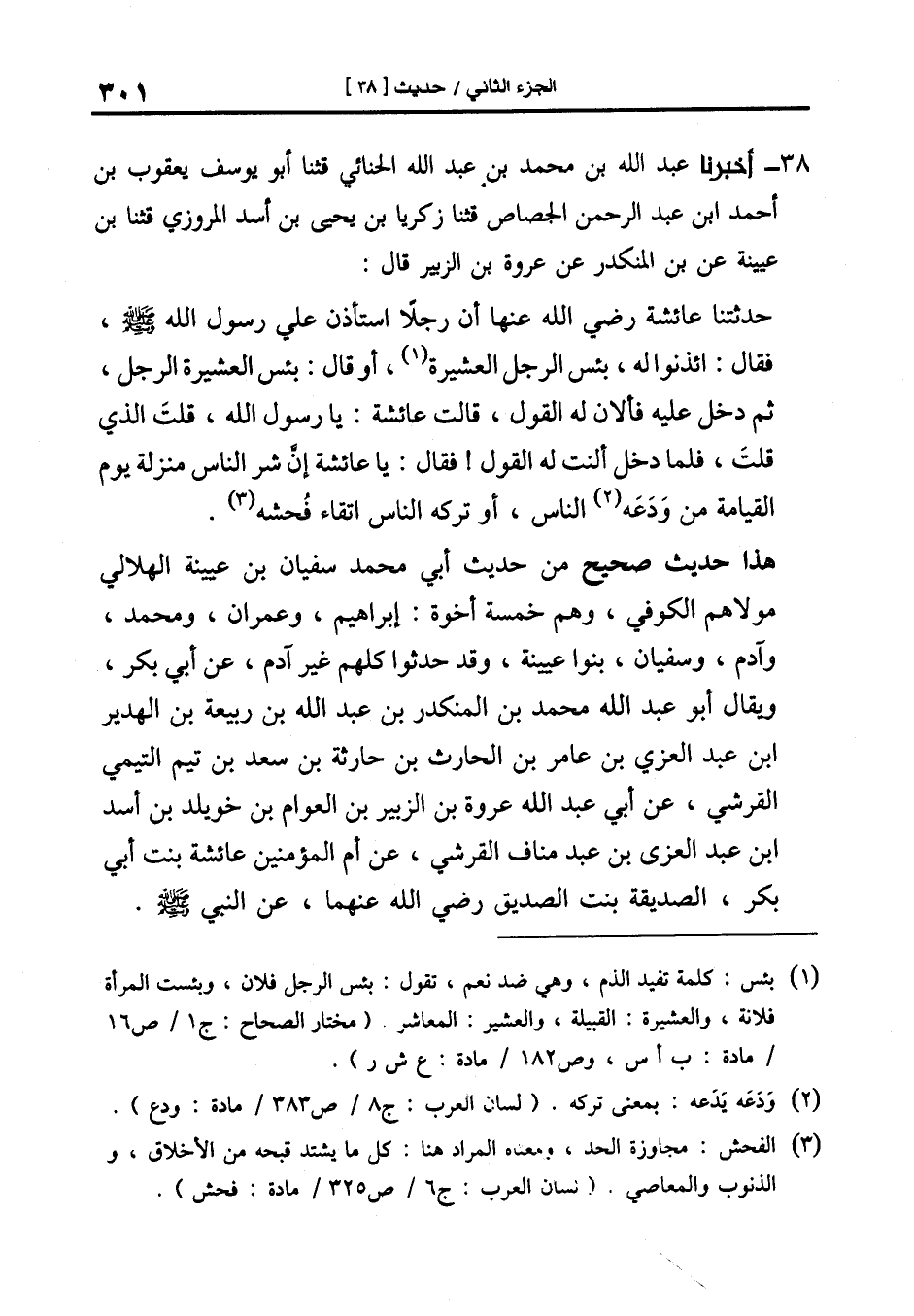 38-[39] أَخْبَرَنَا عَبْدُ اللَّهِ بْنُ مُحَمَّدِ بْنِ عَبْدِ الله الحنائي قال: ثنا أَبُو يُوسُفَ يَعْقُوبُ بْنُ أَحْمَدَ بْنِ عَبْدِ الرحمن الجصاص قال: ثنا زكريا بن يحيى بن أسد المروزي قال: ثنا ابْنُ عُيَيْنَةَ عَنِ ابْنِ الْمُنْكَدِرِ عَنْ عُرْوَةَ بْنِ الزُّبَيْرِ قَالَ: حَدَّثَتْنَا عَائِشَةُ رَضِيَ اللَّهُ عَنْهَا أَنَّ رَجُلا اسْتَأْذَنَ عَلَى رَسُولِ اللَّهِ صَلَّى اللَّهُ عَلَيْهِ وَسَلَّمَ فَقَالَ: ائْذَنُوا لَهُ بئس الرجل العشيرة أو قال: بئس العشيرة الرجل ثُمَّ دَخَلَ عَلَيْهِ فَأَلانَ لَهُ الْقَوْلَ قَالَتْ عَائِشَةُ: يَا رَسُولَ اللَّهِ قُلْتَ الَّذِي قُلْتَ فَلَمَّا دَخَلَ أَلَنْتَ لَهُ الْقَوْلَ! فَقَالَ: يَا عَائِشَةُ إِنَّ شَرَّ النَّاسِ مَنْزِلَةً يَوْمَ الْقِيَامَةِ مَنْ وَدَعَهُ النَّاسُ أَوْ تَرَكَهُ النَّاسُ اتِّقَاءَ فُحْشِهِ.
