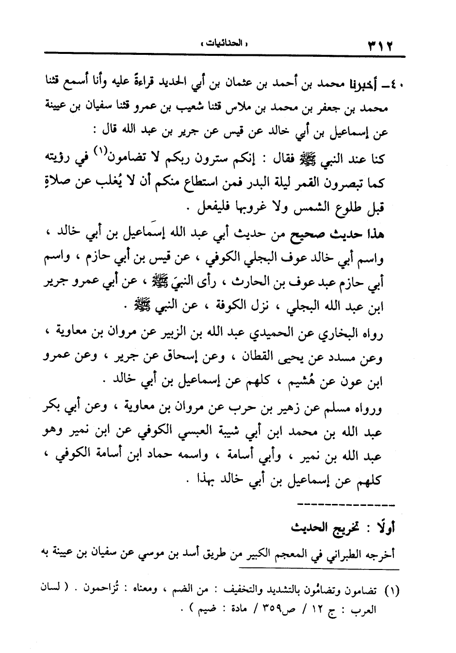 40-[41] أَخْبَرَنَا مُحَمَّدُ بْنُ أَحْمَدَ بْنِ عُثْمَانَ بْنِ أَبِي الْحَدِيدِ قِرَاءَةً عَلَيْهِ وَأَنَا أَسْمَعُ قَالَ: ثنا مُحَمَّدُ بْنُ جَعْفَرِ بْنِ مُحَمَّدِ بْنِ ملاسٍ قال: ثنا شعيب بن عمرو قال: ثنا سُفْيَانُ بْنُ عُيَيْنَةَ عَنْ إِسْمَاعِيلَ بْنِ أَبِي خَالِدٍ عَنْ قَيْسٍ عَنْ جَرِيرِ بْنِ عَبْدِ اللَّهِ قَالَ: كُنَّا عِنْدَ النَّبِيِّ صَلَّى اللَّهُ عَلَيْهِ وَسَلَّمَ فَقَالَ: إِنَّكُمْ سَتَرَوْنَ رَبَّكُمْ لا تُضَامُونَ فِي رُؤْيَتِهِ كَمَا تُبْصِرُونَ الْقَمَرَ لَيْلَةَ البدر فمن استطاع منكم أن لا يُغْلَبَ عَنْ صَلاةٍ قَبْلَ طُلُوعِ الشَّمْسِ وَلا غُرُوبِهَا فَلْيَفْعَلْ.