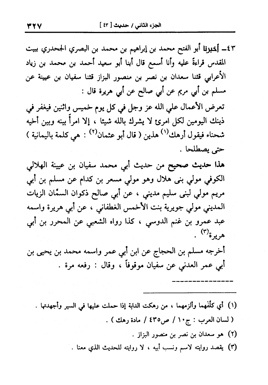 43-[44] أَخْبَرَنَا أَبُو الْفَتْحِ مُحَمَّدُ بْنُ إِبْرَاهِيمَ بْنِ مُحَمَّدِ بْنِ الْبَصْرِيِّ الْجَحْدَرِيُّ بِبَيْتِ الْمَقْدِسِ قِرَاءَةً عَلَيْهِ وَأَنَا أَسْمَعُ قال أبنا أَبُو سَعِيدٍ أَحْمَدُ بْنُ مُحَمَّدِ بْنِ زِيَادٍ الأَعْرَابِيَّ قال: ثنا سعدان بن نصر بن منصور البزار قال: ثنا سُفْيَانُ بْنُ عُيَيْنَةَ عَنْ مُسْلِمِ بْنِ أَبِي مَرْيَمَ عَنْ أَبِي صَالِحٍ عَنْ أَبِي هُرَيْرَةَ قَالَ: تُعْرَضُ الأَعْمَالُ عَلَى اللَّهِ عَزَّ وَجَلَّ فِي كُلِّ يَوْمِ خَمِيسٍ وَاثْنَيْنِ فَيَغْفِرُ فِي ذَيْنِكَ الْيَوْمَيْنِ لِكُلِّ امْرِئٍ لا يُشْرِكُ بِاللَّهِ شيئا إلا امرأ بَيْنَهُ وَبَيْنَ أَخِيهِ شَحْنَاءُ فَيَقُولُ ارْهكْ هَذَيْنِ