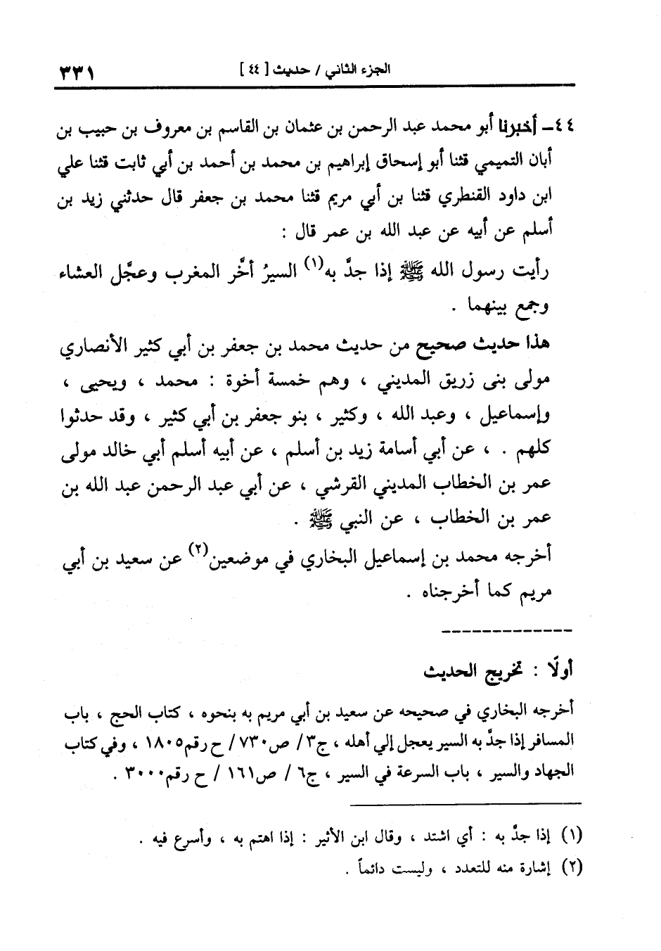 44-[45] أَخْبَرَنَا أَبُو مُحَمَّدٍ عَبْدُ الرَّحْمَنِ بْنُ عُثْمَانَ بْنِ الْقَاسِمِ بْنِ مَعْرُوفِ بْنِ حَبِيبِ بْنِ أبان التميمي قال: ثنا أَبُو إِسْحَاقَ إِبْرَاهِيمُ بْنُ مُحَمَّدِ بْنِ أَحْمَدَ بْنِ أَبِي ثابت قال: ثنا علي بن داود القنطري قال: ثنا بن أبي مريم قال: ثنا مُحَمَّدُ بْنُ جَعْفَرٍ قَالَ حَدَّثَنِي زَيْدُ بْنُ أَسْلَمَ عَنْ أَبِيهِ عَنْ عَبْدِ اللَّهِ بْنِ عُمَرَ قَالَ: رَأَيْتُ رَسُولُ اللَّهِ صَلَّى اللَّهُ عَلَيْهِ وَسَلَّمَ إِذَا جد بِهِ السَّيْرُ أَخَّرَ الْمَغْرِبَ وَعَجَّلَ الْعِشَاءَ وَجَمَعَ بَيْنَهُمَا.