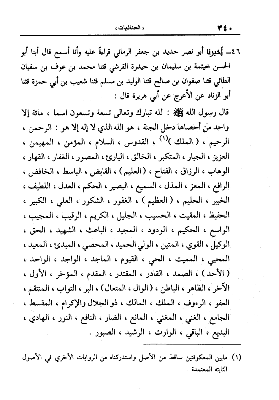 46-[47] أَخْبَرَنَا أَبُو نَصْرٍ حَدِيدُ بْنُ جَعْفَرٍ الرُّمَّانِيُّ قِرَاءَةً عَلَيْهِ وَأَنَا أَسْمَعُ قال أبنا أَبُو الْحَسَنِ خَيْثَمَةُ بْنُ سُلَيْمَانَ بْنِ حَيْدَرَةَ القرشي قال: ثنا محمد بن عوف بن سفيان الطائي قال: ثنا صفوان بن صالح قال: ثنا الوليد بن مسلم قال: ثنا شعيب بن أبي حمزة قال: ثنا أَبُو الزِّنَادِ عَنِ الأَعْرَجِ عَنْ أَبِي هُرَيْرَةَ قَالَ: قَالَ رَسُولُ اللَّهِ صَلَّى اللَّهُ عَلَيْهِ وَسَلَّمَ: لِلَّهِ تَبَارَكَ وَتَعَالَى تِسْعَةٌ وَتِسْعُونَ اسْمًا مائة إلا واحد مَنْ أَحْصَاهَا دَخَلَ الْجَنَّةَ هُوَ اللَّهُ الَّذِي لا إله إلا هو: الرحمن الرحيم الملك الْقُدُّوسُ السَّلامُ الْمُؤْمِنُ الْمُهَيْمِنُ الْعَزِيزُ الْجَبَّارُ الْمُتَكَبِّرُ الْخَالِقُ الْبَارِئُ الْمُصَوِّرُ الْغَفَّارُ الْقَهَّارُ الْوَهَّابُ الرَّزَّاقُ الفتاح العليم الْقَابِضُ الْبَاسِطُ الْخَافِضُ الرَّافِعُ الْمُعِزُّ الْمُذِلُّ السَّمِيعُ البصير الحكم العدل اللطيف الخبير الحليم العظيم الْغَفُورُ الشَّكُورُ الْعَلِيُّ الْكَبِيرُ الْحَفِيظُ الْمُقِيتُ الْحَسِيبُ الْجَلِيلُ الْكَرِيمُ الرَّقِيبُ الْمُجِيبُ الْوَاسِعُ الْحَكِيمُ الْوَدُودُ الْمَجِيدُ الْبَاعِثُ الشَّهِيدُ الْحَقُّ الْوَكِيلُ الْقَوِيُّ الْمَتِينُ الْوَلِيُّ الْحَمِيدُ الْمُحْصِي الْمُبْدِئُ الْمُعِيدُ الْمُحْيِي الْمُمِيتُ الْحَيُّ الْقَيُّومُ الْمَاجِدُ الْوَاجِدُ الْوَاحِدُ الأَحَدُ الصَّمَدُ الْقَادِرُ الْمُقْتَدِرُ الْمُقَدِّمُ الْمُؤَخِّرُ الأَوَّلُ الآخِرُ الظَّاهِرُ الباطن الوال المتعال البر التواب المنتقم العفو الرؤوف الْمَلِكُ الْمَالِكُ ذُو الْجَلالِ وَالإِكْرَامِ الْمُقْسِطُ الْجَامِعُ الْغَنِيُّ الْمُغْنِي الْمَانِعُ الضَّارُّ النَّافِعُ النُّورُ الْهَادِي الْبَدِيعُ الْبَاقِي الْوَارِثُ الرَّشِيدُ الصَّبُورُ.