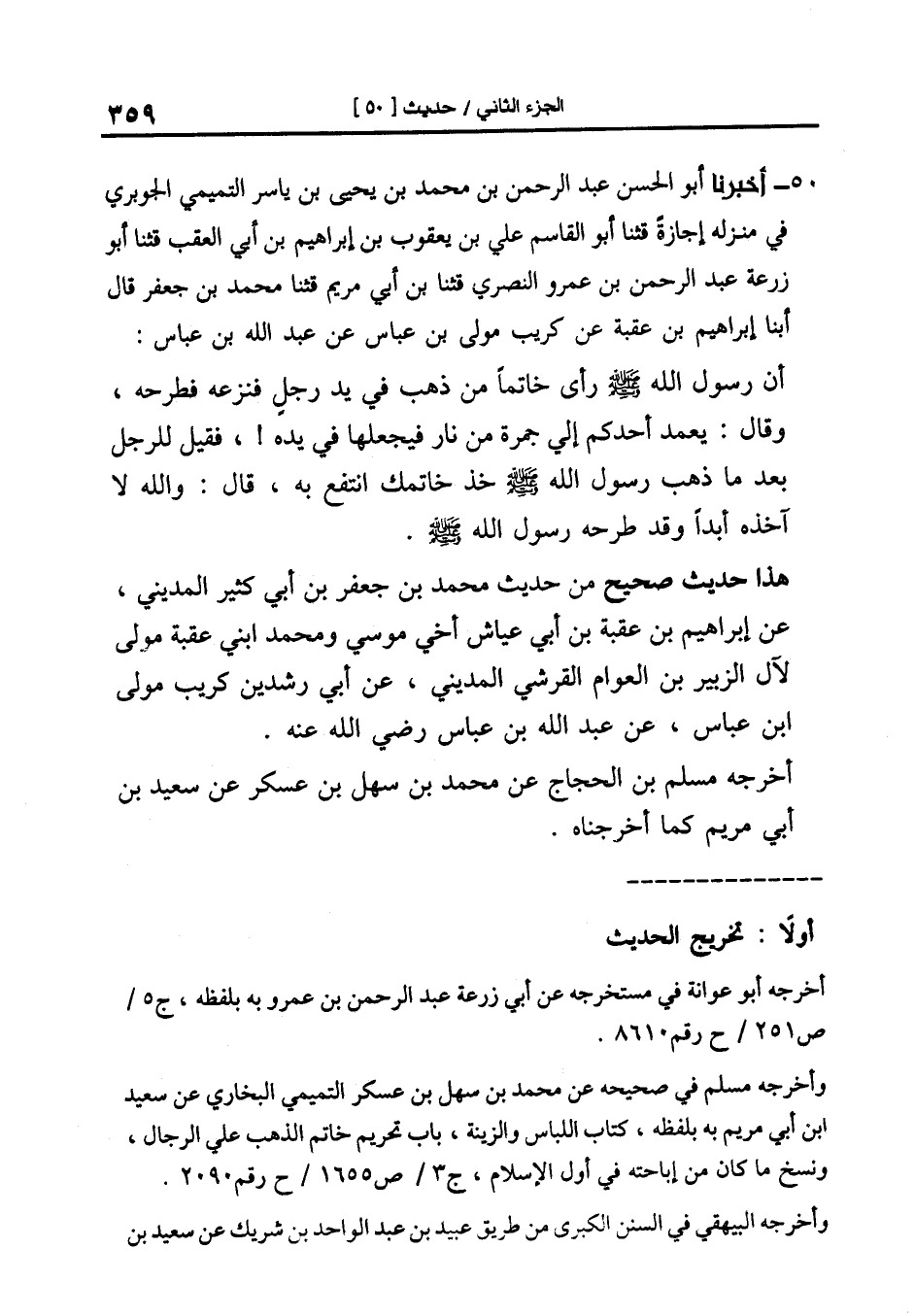 50-[52] أَخْبَرَنَا أَبُو الْحَسَنِ عَبْدُ الرَّحْمَنِ بْنُ مُحَمَّدِ بْنِ يَحْيَى بْنِ يَاسِرٍ التَّمِيمِيُّ الْجَوْبَرِيُّ فِي منزله إجازة قال: ثنا أَبُو الْقَاسِمِ عَلِيُّ بْنُ يَعْقُوبَ بْنِ إِبْرَاهِيمَ بن أبي العقب قَالَ: ثنا أَبُو زُرْعَةَ عَبْدُ الرَّحْمَنِ بْنُ عَمْرٍو النَّصْرِيُّ قال: ثنا ابن أبي مريم قال: ثنا محمد بن جعفر قال أبنا إِبْرَاهِيمُ بْنُ عُقْبَةَ عَنْ كُرَيْبٍ مَوْلَى ابْنِ عَبَّاسٍ عَنْ عَبْدَ اللَّهِ بْنَ عَبَّاسٍ: أَنَّ رَسُولَ اللَّهِ صَلَّى اللَّهُ عَلَيْهِ وَسَلَّمَ رَأَى خَاتَمًا مِنْ ذَهَبٍ فِي يَدِ رَجُلٍ فَنَزَعَهُ فَطَرَحَهُ وَقَالَ: يَعْمِدُ أَحَدُكُمْ إِلَى جَمْرَةٍ مِنْ نار فيجعلها في يده فقيل للرجل بعد ما ذَهَبَ رَسُولُ اللَّهِ صَلَّى اللَّهُ عَلَيْهِ وَسَلَّمَ خُذْ خَاتَمَكَ انْتَفِعْ بِهِ، قَالَ: وَاللَّهِ لا آخُذُهُ أَبَدًا وَقَدْ طَرَحَهُ رَسُولُ اللَّهِ صَلَّى اللَّهُ عَلَيْهِ وَسَلَّمَ.