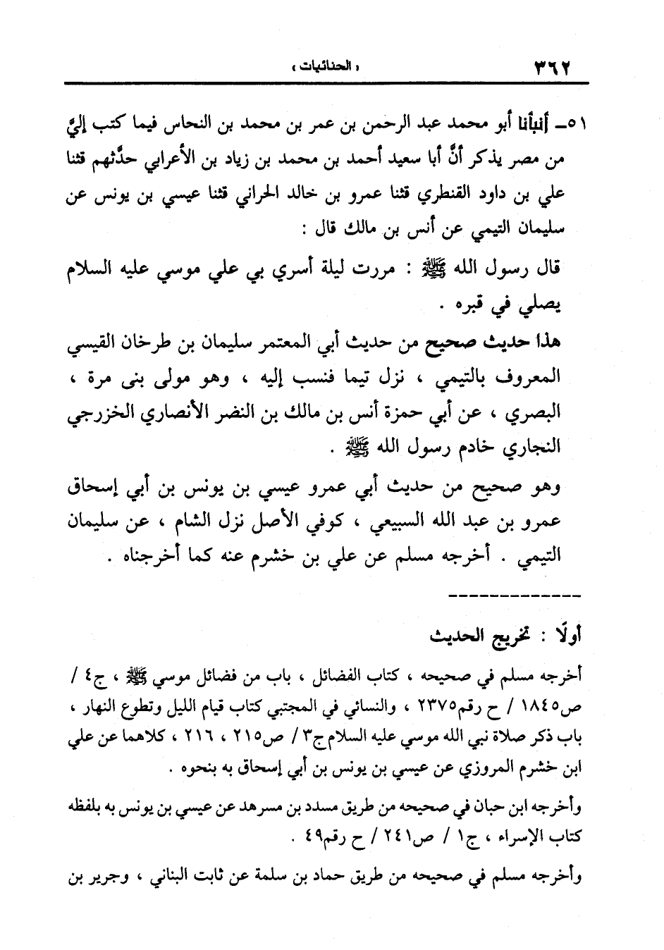 51-[53] أَنْبَأَنَا أَبُو مُحَمَّدٍ عَبْدُ الرَّحْمَنِ بْنُ عُمَرَ بْنِ مُحَمَّدِ بْنِ النَّحَّاسِ فِيمَا كَتَبَ إِلَيَّ مِنْ مِصْرَ يَذْكُرُ أَنَّ أَبَا سَعِيدٍ أَحْمَدَ بْنَ مُحَمَّدِ بْنِ زِيَادِ بْنِ الْأَعْرَابِيِّ حَدَّثَهُمْ قال: ثنا علي بن داود القنطري قال: ثنا عمرو بن خالد الحراني قال: ثنا عِيسَى بْنُ يُونُسَ عَنْ سُلَيْمَانَ التَّيْمِيِّ عَنْ أَنَسِ بْنِ مَالِكٍ قَالَ: قَالَ رَسُولُ اللَّهِ صَلَّى اللَّهُ عَلَيْهِ وَسَلَّمَ: مَرَرْتُ لَيْلَةَ أُسْرِيَ بِي عَلَى مُوسَى عَلَيْهِ السَّلامُ يُصَلِّي فِي قَبْرِهِ.