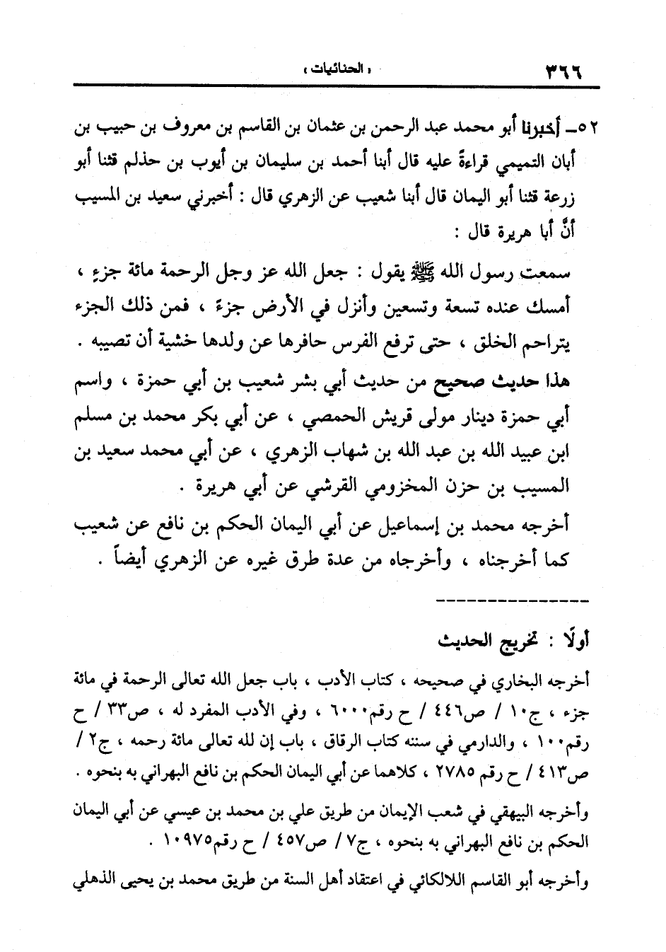 52-[54] أَخْبَرَنَا أَبُو مُحَمَّدٍ عَبْدُ الرَّحْمَنِ بْنُ عُثْمَانَ بْنِ الْقَاسِمِ بْنِ مَعْرُوفِ بْنِ حَبِيبِ بْنِ أبان التميمي قراءة عليه أبنا أَحْمَدُ بْنُ سُلَيْمَانَ بْنِ أَيُّوبَ بْنِ حَذْلَمٍ قال: ثنا أبو زرعة قال: ثنا أبو اليمان قال أبنا شُعَيْبٌ عَنِ الزُّهْرِيِّ قَالَ: أَخْبَرَنِي سَعِيدُ بْنُ الْمُسَيَّبِ أن أبا هُرَيْرَةَ قَالَ: سَمِعْتُ رَسُولَ اللَّهِ صَلَّى اللَّهُ عَلَيْهِ وَسَلَّمَ يَقُولُ: جَعَلَ اللَّهُ عَزَّ وَجَلَّ الرَّحْمَةَ مِائَةَ جُزْءٍ أَمْسَكَ عِنْدَهُ تِسْعَةً وَتِسْعِينَ وَأَنْزَلَ فِي الأرض جزء فَمِنْ ذَلِكَ الْجُزْءِ يَتَرَاحَمُ الْخَلْقُ حَتَّى تَرْفَعَ الْفَرَسُ حَافِرَهَا عَنْ وَلَدِهَا خَشْيَةَ أَنْ تُصِيبَهُ.