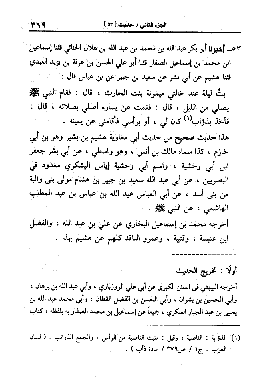 53-[55] أَخْبَرَنَا أَبُو بَكْرٍ عَبْدُ اللَّهِ بْنُ مُحَمَّدِ بْنِ عَبْدِ اللَّهِ بْنِ هِلالٍ الْحِنَّائِيُّ قَالَ: ثنا إِسْمَاعِيلُ بْنُ مُحَمَّدِ بْنِ إِسْمَاعِيلَ الصَّفَّارُ قال: ثنا أَبُو عَلِيٍّ الْحَسَنُ بْنُ عَرَفَةَ بْنِ يَزِيدَ العبدي قال: ثنا هُشَيْمٌ عَنْ أَبِي بِشْرٍ عَنْ سَعِيدِ بْنِ جُبَيْرٍ عَنِ ابْنِ عَبَّاسٍ قَالَ: بِتُّ لَيْلَةً عِنْدَ خَالَتِي مَيْمُونَةَ بِنْتِ الْحَارِثِ قَالَ: فَقَامَ النَّبِيُّ صَلَّى اللَّهُ عَلَيْهِ وَسَلَّمَ يُصَلِّي مِنَ اللَّيْلِ قَالَ: فَقُمْتُ عَنْ يَسَارِهِ أُصَلِّي بِصَلاتِهِ قَالَ: فَأَخَذَ بَذُؤَابٍ كَانَ لِي أَوْ بِرَأْسِي فَأَقَامَنِي عَنْ يَمِينِهِ.