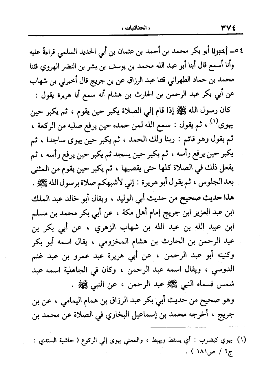 54-[56] أَخْبَرَنَا أَبُو بَكْرٍ مُحَمَّدُ بْنُ أَحْمَدَ بْنِ عُثْمَانَ بْنِ أَبِي الْحَدِيدِ السُّلَمِيِّ قِرَاءَةً عَلَيْهِ وَأَنَا أَسْمَعُ قال أبنا أَبُو عَبْدِ اللَّهِ مُحَمَّدُ بْنُ يُوسُفَ بْنِ بشر بن النضر الهروي قال: ثنا محمد بن حماد الطهراني قال: ثنا عَبْدُ الرَّزَّاقِ عَنِ ابْنِ جُرَيْجٍ قَالَ أَخْبَرَنِي ابن شهاب عن أبي بكر عَبْدِ الرَّحْمَنِ بْنِ الْحَارِثِ بْنِ هِشَامٍ أَنَّهُ سَمِعَ أَبَا هُرَيْرَةَ يَقُولُ: كَانَ رَسُولُ اللَّهِ صَلَّى اللَّهُ عَلَيْهِ وَسَلَّمَ إِذَا قَامَ إِلَى الصَّلاةِ يُكَبِّرُ حِينَ يَقُومُ ثُمَّ يُكَبِّرُ حِينَ يَهْوِي ثُمَّ يَقُولُ: سَمِعَ اللَّهُ لِمَنْ حَمِدَهُ حِينَ يَرْفَعُ صُلْبَهُ مِنَ الرَّكْعَةِ ثُمَّ يَقُولُ وَهُوَ قَائِمٌ: رَبَّنَا وَلَكَ الْحَمْدُ ثُمَّ يُكَبِّرُ حِينَ يَهْوِي سَاجِدًا ثُمَّ يُكَبِّرُ حِينَ يَرْفَعُ رَأْسَهُ ثُمَّ يُكَبِّرُ حِينَ يَسْجُدُ ثُمَّ يُكَبِّرُ حِينَ يَرْفَعُ رَأْسَهُ ثُمَّ يَفْعَلُ ذَلِكَ فِي الصَّلاةِ كُلِّهَا حَتَّى يَقْضِيَهَا ثُمَّ يُكَبِّرُ حِينَ يَقُومُ مِنَ الْمُثَنَّى بَعْدَ الْجُلُوسِ ثُمَّ يَقُولُ أَبُو هُرَيْرَةَ: إِنِّي لأَشْبَهُكُمْ صَلاةً بِرَسُولِ اللَّهِ صَلَّى اللَّهُ عَلَيْهِ وَسَلَّمَ.