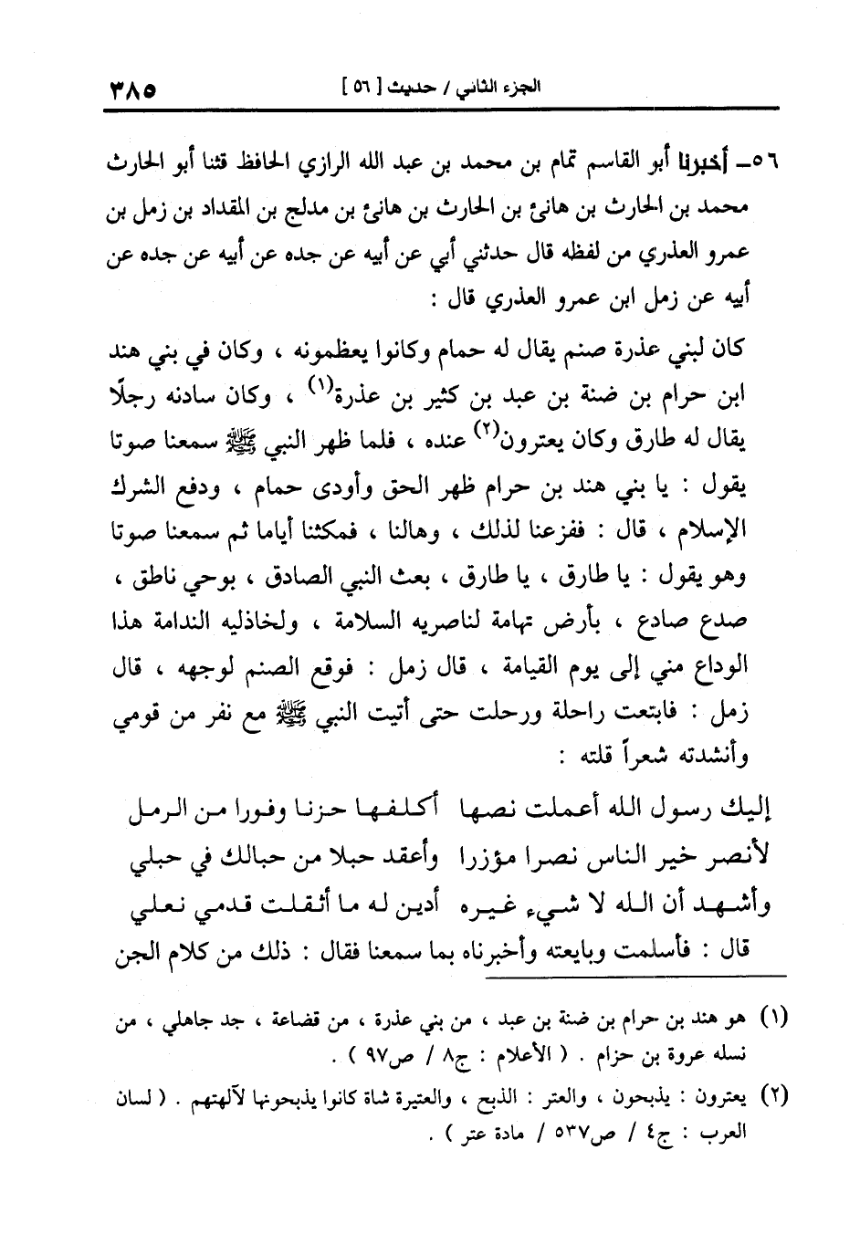 56-[58] أَخْبَرَنَا أَبُو الْقَاسِمِ تَمَّامُ بْنُ مُحَمَّدِ بْنِ عبد الله الرازي الحافظ قال: ثنا أَبُو الْحَارِثِ مُحَمَّدُ بْنُ الْحَارِثِ بْنِ هَانِئِ بن مدلج بن المقداد بْنِ زِمْلِ بْنِ عَمْرٍو الْعُذْرِيُّ مِنْ لَفْظِهِ قَالَ حَدَّثَنِي أَبِي عَنْ أَبِيهِ عَنْ جَدِّهِ عَنْ أَبِيهِ عَنْ جَدِّهِ عَنْ أَبِيهِ عَنْ زِمْلِ بْنِ عَمْرٍو الْعُذْرِيِّ قَالَ: كَانَ لِبَنِي عُذْرَةَ صَنَمٌ يُقَالُ لَهُ حُمَامٌ وَكَانُوا يُعَظِّمُونَهُ وَكَانَ فِي بَنِي هِنْدِ بْنِ حَرَامِ بْنِ ضنة بن عبد كَثِيرِ بْنِ عُذْرَةَ وَكَانَ سَادِنُهُ رَجُلا يُقَالُ له طارق وكان يَعْتِرُونَ عِنْدَهُ فَلَمَّا ظَهَرَ النَّبِيُّ صَلَّى اللَّهُ عَلَيْهِ وَسَلَّمَ سَمِعْنَا صَوْتًا يَقُولُ: يَا بَنِي هِنْدِ بْنِ حَرََامٍ ظَهَرَ الْحَقُّ وَأَوْدَى حُمَامٌ وَدَفَعَ الشِّرْكَ الإِسْلامُ قَالَ: فَفُزِعْنَا لِذَلِكَ وَهَالَنَا فَمَكَثْنَا أَيَّامًا ثُمَّ سَمِعْنَا صَوْتًا وَهُوَ يَقُولُ: يَا طَارِقُ يَا طَارِقُ بُعِثَ النَّبِيُّ الصَّادِقُ بِوَحْيٍ نَاطِقٍ صَدَعَ صَادِعٌ بِأَرْضِ تِهَامَةَ لِنَاصِرِيهِ السَّلَامَةُ وَلِخَاذِلِيهِ النَّدَامَةُ هَذَا الْوَدَاعُ مِنِّي إِلَى يَوْمِ الْقِيَامَةِ قَالَ زِمْلٌ: فَوَقَعَ الصَّنَمُ لِوَجْهِهِ