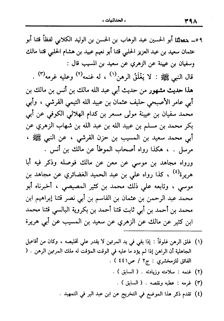 59-[61] حَدَّثَنَا أَبُو الْحُسَيْنِ عَبْدُ الْوَهَّابِ بْنُ الْحَسَنِ بْنِ الوليد الكلابي لفظا قال: ثنا أَبُو عُثْمَانَ سَعِيدُ بْنُ عَبْدِ الْعَزِيزِ الْحَلَبِيُّ قال: ثنا أبو نعيم عبيد بن هشام الحلبي قال: ثنا مَالِكٌ وَسُفْيَانُ بْنُ عُيَيْنَةَ عَنِ الزُّهْرِيِّ عَنْ سَعِيدِ بْنِ الْمُسَيِّبِ قَالَ: قَالَ النَّبِيُّ صَلَّى اللَّهُ عَلَيْهِ وَسَلَّمَ: لا يُغْلَقُ الرَّهْنُ لَهُ غُنْمُهُ وَعَلَيْهِ غُرْمُهُ.