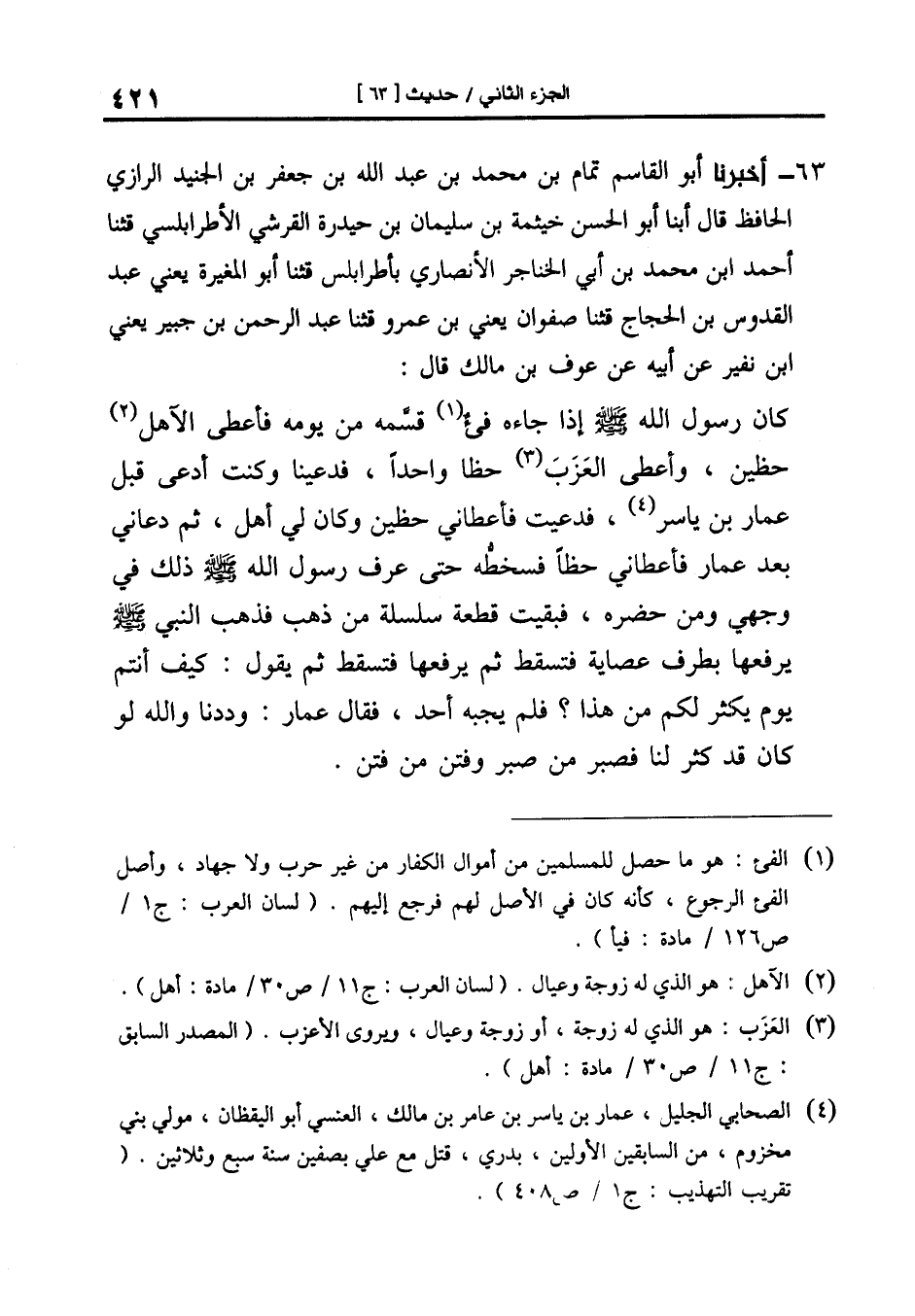 63-[66] أَخْبَرَنَا أَبُو الْقَاسِمِ تَمَّامُ بْنُ مُحَمَّدِ بْنِ عَبْدِ اللَّهِ بْنِ جَعْفَرِ بْنِ الْجُنَيْدِ الرَّازِيُّ الحافظ قال أبنا أَبُو الْحَسَنِ خَيْثَمَةُ بْنُ سُلَيْمَانَ بْنِ حَيْدَرَةَ القرشي الأطرابلسي قال: ثنا أَحْمَدُ بْنُ مُحَمَّدِ بْنِ أَبِي الْخَنَاجِرِ الأَنْصَارِيُّ بأطرابلس قال: ثنا أَبُو الْمُغِيرَةِ يَعْنِي عَبْدَ الْقُدُّوسِ بْنَ الْحَجَّاجِ قال: ثنا صفوان يعني بن عمرو قال: ثنا عَبْدُ الرَّحْمَنِ بْنُ جُبَيْرٍ يَعْنِي ابْنَ نُفَيْرٍ عَنْ أَبِيهِ عَنْ عَوْفِ بْنِ مَالِكٍ قَالَ: كَانَ رَسُولُ اللَّهِ صَلَّى اللَّهُ عَلَيْهِ وَسَلَّمَ إِذَا جاءه فئ قَسَمَهُ مِنْ يَوْمِهِ فَأَعْطَى الآهِلَ حَظَّيْنِ وَأَعْطَى الْعَزَبَ حَظًّا وَاحِدًا فَدُعِينَا وَكُنْتُ أُدْعَى قَبْلَ عَمَّارِ بْنِ يَاسِرٍ فَدُعِيتُ فَأَعْطَانِي حَظَّيْنِ وَكَانَ لِي أَهْلٌ ثُمَّ دَعَانِي بَعْدَ عَمَّارٍ فَأَعْطَانِي حظا فسخطه حَتَّى عَرَفَ رَسُولُ اللَّهِ صَلَّى اللَّهُ عَلَيْهِ وَسَلَّمَ ذَلِكَ فِي وَجْهِي وَمَنْ حَضَرَهُ فَبَقِيَتْ قِطْعَةٌ سِلْسِلَةٌ مِنْ ذَهَبٍ فَذَهَبَ النَّبِيُّ صَلَّى الله عليه وسلم يرفعها بطرف عصاته فَتَسْقُطُ ثُمَّ يَرْفَعُهَا فَتَسْقُطُ ثُمَّ يَقُولُ: كَيْفَ أَنْتُمْ يَوْمَ يَكْثُرُ لَكُمْ مِنْ هَذَا؟ فَلَمْ يجبه أحد، فَقَالَ عَمَّارٌ: وَدِدْنَا وَاللَّهِ لَوْ كَانَ قَدْ كَثُرَ لَنَا فَصَبَرَ مَنْ صَبَرَ وَفُتِنَ مَنْ فُتِنَ.