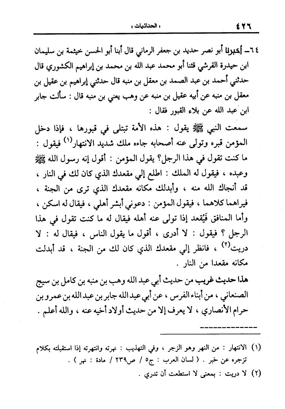 64-[67] أَخْبَرَنَا أَبُو نَصْرٍ حَدِيدُ بْنُ جَعْفَرٍ الرّمَانِيُّ قال أبنا أَبُو الْحَسَنِ خَيْثَمَةُ بْنُ سُلَيْمَانَ بْنِ حَيْدَرَةَ القرشي قال: ثنا أَبُو مُحَمَّدٍ عَبْدُ اللَّهِ بْنُ مُحَمَّدِ بْنِ إِبْرَاهِيمَ الْكَشْوَرِيُّ قَالَ حَدَّثَنِي أَحْمَدُ بْنُ عَبْدِ الصمد بن معقل بن منبه قال حدثني إِبْرَاهِيمَ بْنِ عَقِيلِ بْنِ مَعْقِلِ بْنِ مُنَبِّهٍ عَنْ أَبِيهِ عَقِيلِ بْنِ مُنَبِّهٍ عَنْ وَهْبٍ يَعْنِي ابْنَ مُنَبِّهٍ قَالَ: سَأَلْتُ جَابِرَ بْنَ عَبْدِ اللَّهِ عَنْ بَلاءِ الْقُبُورِ فَقَالَ: سَمِعْتُ النَّبِيَّ صَلَّى اللَّهُ عَلَيْهِ وَسَلَّمَ يَقُولُ: هَذِهِ الأُمَّةُ تبتلى في قبورها فإذا دخل الْمُؤْمِنُ قَبْرَهُ وَتَوَلَّى عَنْهُ أَصْحَابُهُ جَاءَهُ مَلَكٌ شَدِيدُ الانْتِهَارِ فَيَقُولُ: مَا كُنْتَ تَقُولُ فِي هَذَا الرَّجُلِ؟ يَقُولُ الْمُؤْمِنُ: أَقُولُ إِنَّهُ رَسُولُ الله صلى الله عليه وسلم وَعَبْدُهُ فَيَقُولُ لَهُ الْمَلَكُ: اطَّلِعْ إِلَى مَقْعَدِكَ الَّذِي كَانَ لَكَ فِي النَّارِ قَدْ أَنْجَاكَ اللَّهُ مِنْهُ وَأَبْدَلَكَ مَكَانَهُ مَقْعَدَكَ الَّذِي تَرَى مِنَ الْجَنَّةِ فَيَرَاهُمَا كِلاهُمَا فَيَقُولُ الْمُؤْمِنُ: دَعُونِي أُبَشِّرُ أَهْلِي فَيُقَالُ لَهُ اسْكُنْ وَأَمَّا الْمُنَافِقُ فَيَقْعُدُ إِذَا تَوَلَّى عَنْهُ أَهْلُهُ فَيُقَالُ لَهُ مَا كُنْتَ تَقُولُ فِي هَذَا الرَّجُلِ؟ فَيَقُولُ: لا أَدْرِي أَقُولُ مَا يَقُولُ النَّاسُ فَيُقَالُ لَهُ: لا دَرَيْتَ فَانْظُرْ إِلَى مَقْعَدِكَ الَّذِي كَانَ لَكَ مِنَ الْجَنَّةِ قَدْ أُبْدِلْتَ مَكَانَهُ مَقْعَدًا مِنَ النَّارِ.