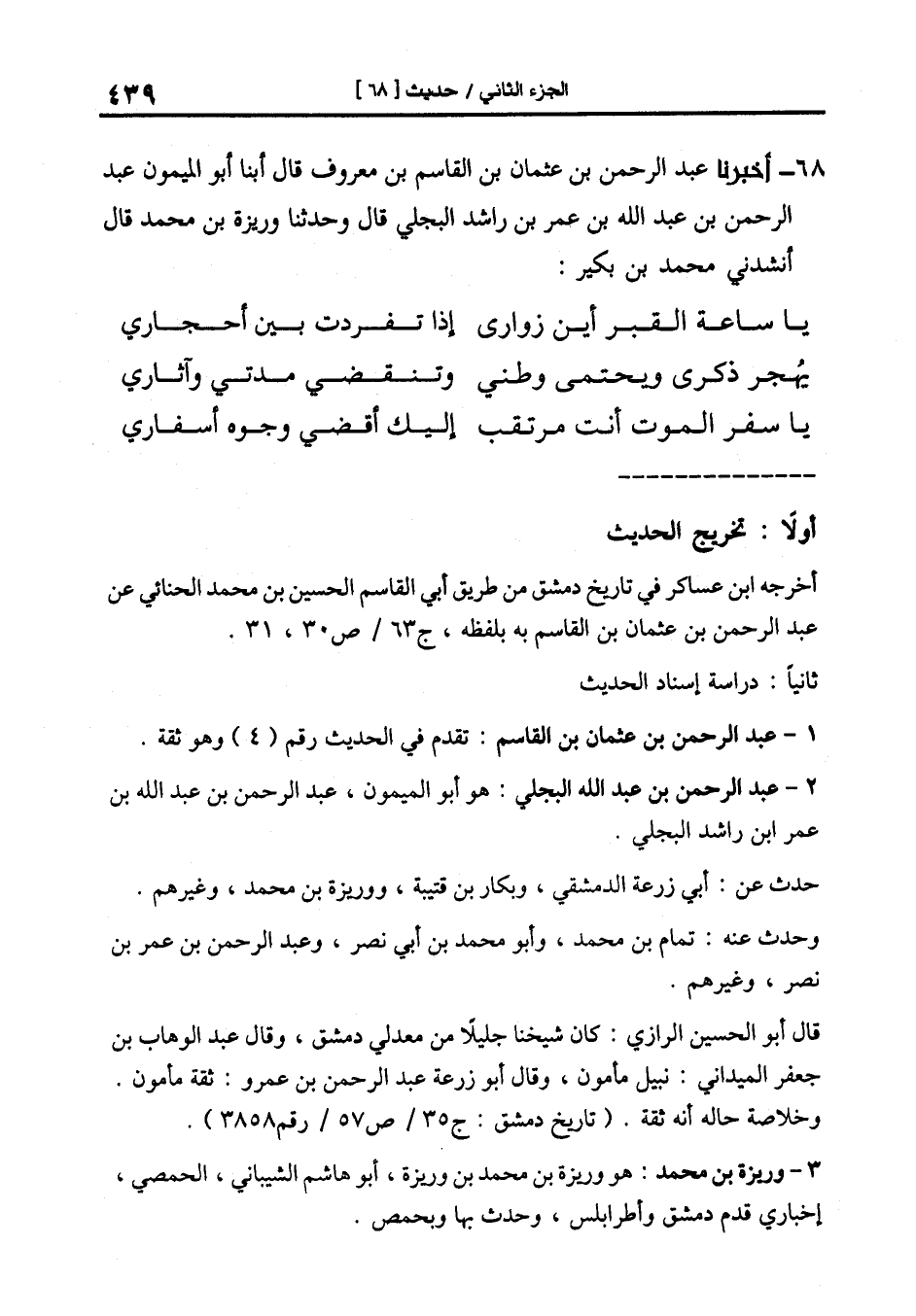 68-[71] أَخْبَرَنَا عَبْدُ الرَّحْمَنِ بْنُ عُثْمَانَ بْنِ الْقَاسِمِ بْنِ معروف قال أبنا أَبُو الْمَيْمُونِ عَبْدُ الرَّحْمَنِ بْنُ عَبْدِ اللَّهِ بْنِ عُمَرَ بْنِ رَاشِدٍ الْبَجَلِيُّ قَالَ وَحَدَّثَنَا وريزة بْنُ مُحَمَّدٍ قَالَ أَنْشَدَنِي مُحَمَّدُ بْنُ بكير: