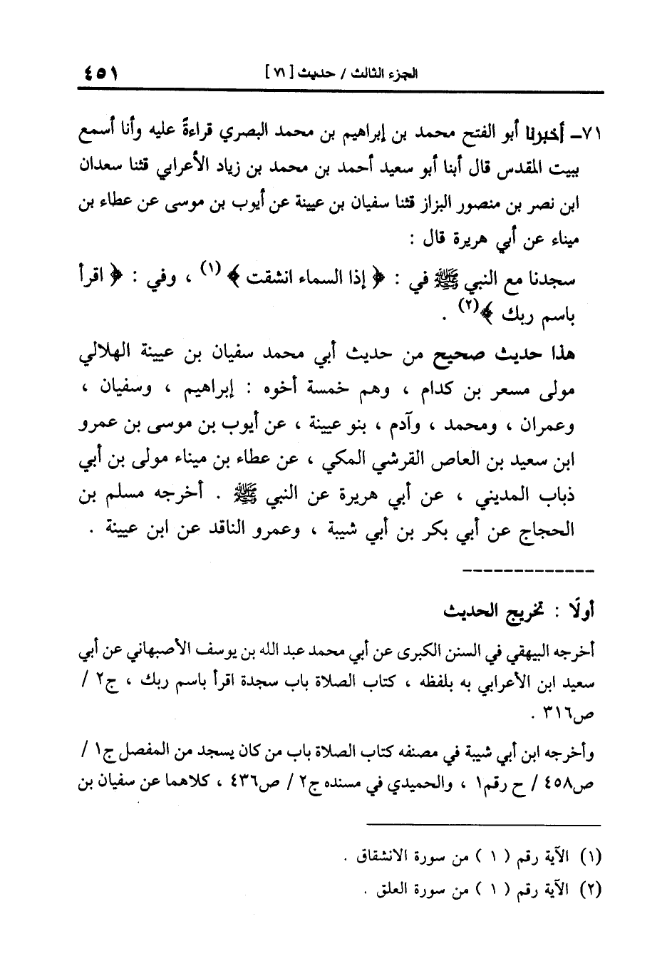 71-[74] أَخْبَرَنَا أَبُو الْفَتْحِ مُحَمَّدُ بْنُ إِبْرَاهِيمَ بْنِ مُحَمَّدٍ الْبَصْرِيُّ قِرَاءَةً عَلَيْهِ وَأَنَا أَسْمَعُ بِبَيْتِ المقدس قال أبنا أَبُو سَعِيدٍ أَحْمَدُ بْنُ مُحَمَّدِ بْنِ زِيَادٍ الأَعْرَابِيَّ قال: ثنا سعدان بن نصر بن منصور البزاز قال: ثنا سُفْيَانُ بْنُ عُيَيْنَةَ عَنْ أَيُّوبَ بْنِ مُوسَى عَنْ عَطَاءِ بْنِ مَيْنَاءَ عَنْ أَبِي هُرَيْرَةَ قَالَ: سَجَدْنَا مَعَ النَّبِيِّ صَلَّى اللَّهُ عَلَيْهِ وَسَلَّمَ فِي: {إِذَا السَّمَاءُ انْشَقَّتْ} وَفِي {اقْرَأْ باسم رَبِّكَ} .
