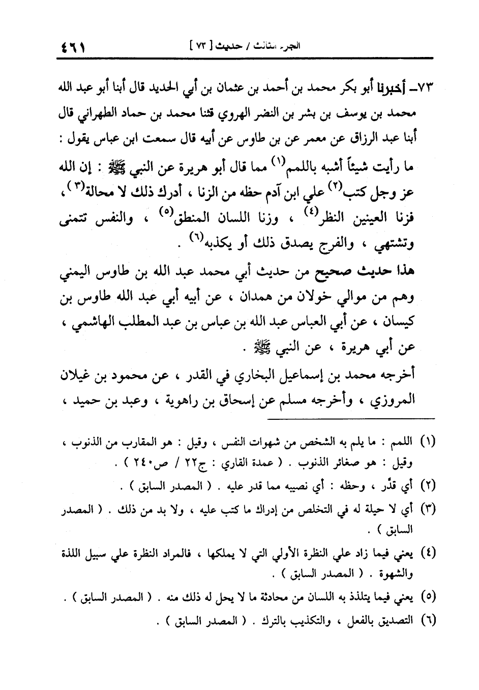 73-[76] أَخْبَرَنَا أَبُو بَكْرٍ مُحَمَّدُ بْنُ أَحْمَدَ بْنِ عثمان بن أبي الحديد قال أبنا أَبُو عَبْدِ اللَّهِ مُحَمَّدُ بْنُ يُوسُفَ بْنِ بشر بن النضر الهروي قال: ثنا محمد بن حماد الطهراني قال أبنا عبد الرزاق عن معمر عن ابن طَاوُسٍ عَنْ أَبِيهِ قَالَ سَمِعْتُ ابْنَ عَبَّاسٍ يقول: ما رأيت شيئا أشبه باللمم مِمَّا قَالَ أَبُو هُرَيْرَةَ عَنِ النَّبِيِّ صَلَّى اللَّهُ عَلَيْهِ وَسَلَّمَ: إِنَّ اللَّهَ عَزَّ وَجَلَّ كَتَبَ عَلَى ابْنِ آدَمَ حَظَّهُ مِنَ الزِّنَا أَدْرَكَ ذَلِكَ لَا مَحَالَةَ فَزِنَا الْعَيْنَيْنِ النَّظَرُ وَزِنَا اللِّسَانِ الْمَنْطِقُ وَالنَّفْسُ تَتَمَنَّى وَتَشْتَهِي وَالْفَرْجُ يُصَدِّقُ ذَلِكَ أَوْ يُكَذِّبُهُ.