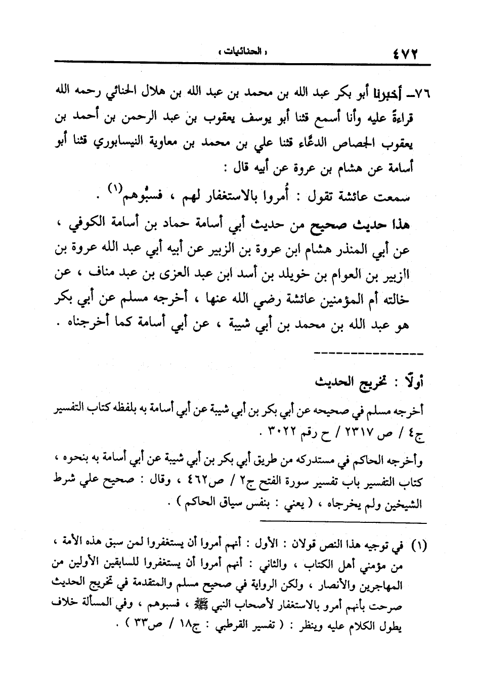 76-[79] أَخْبَرَنَا أَبُو بَكْرٍ عَبْدُ اللَّهِ بْنُ مُحَمَّدِ بْنِ عَبْدِ اللَّهِ بْنِ هِلَالٍ الْحِنَّائِيُّ رَحِمَهُ اللَّهُ قِرَاءَةً عَلَيْهِ وَأَنَا أَسْمَعُ قَالَ: ثنا أَبُو يُوسُفَ يَعْقُوبُ بْنُ عَبْدِ الرَّحْمَنِ بْنِ أحمد بن يعقوب الجصاص الدعاء قال: ثنا علي بن محمد بن معاوية النيسابوري قال: ثنا أَبُو أُسَامَةَ عَنْ هِشَامِ بْنِ عُرْوَةَ عَنْ أَبِيهِ قَالَ: